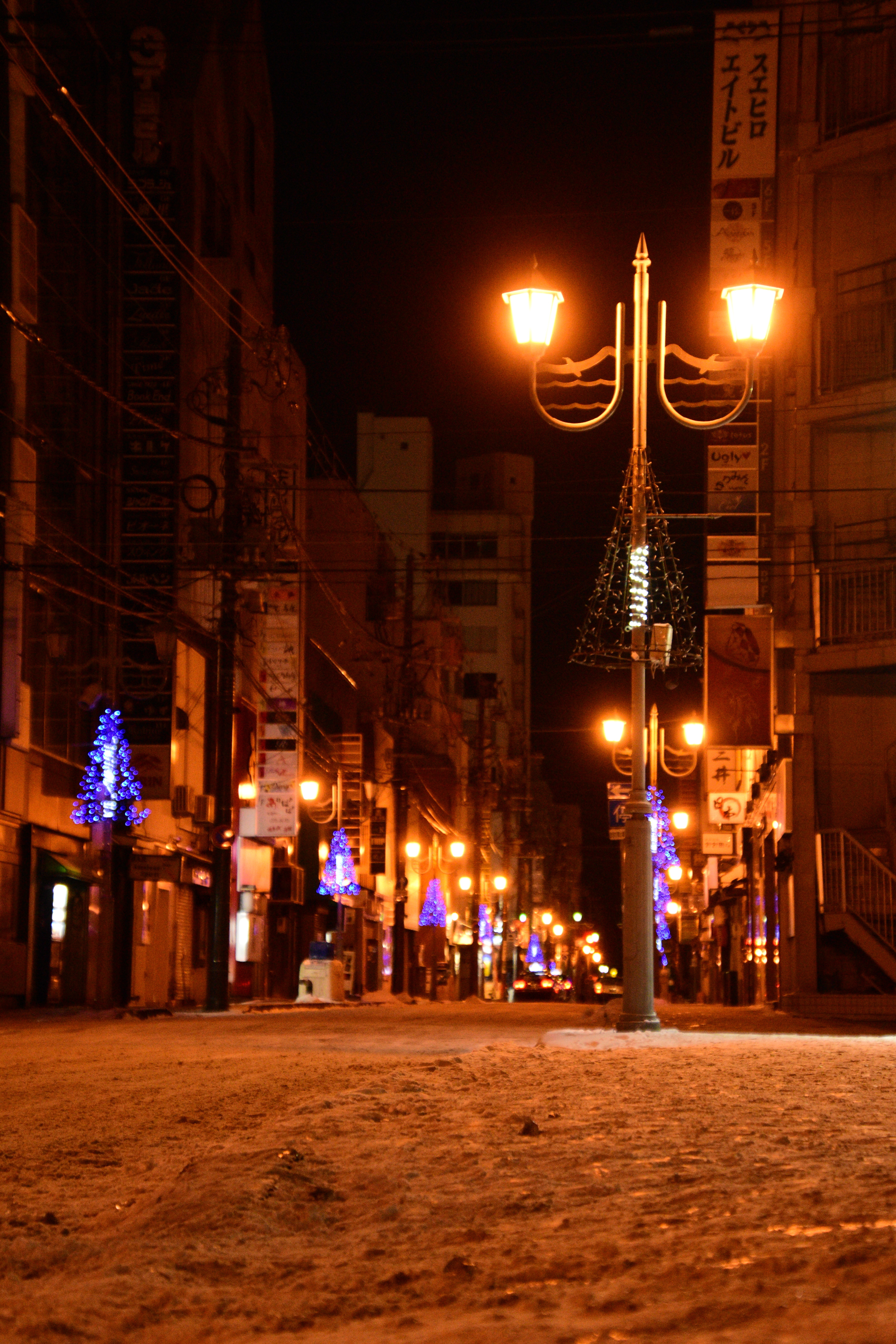 少し雪のある街中の夜景、いいですね。