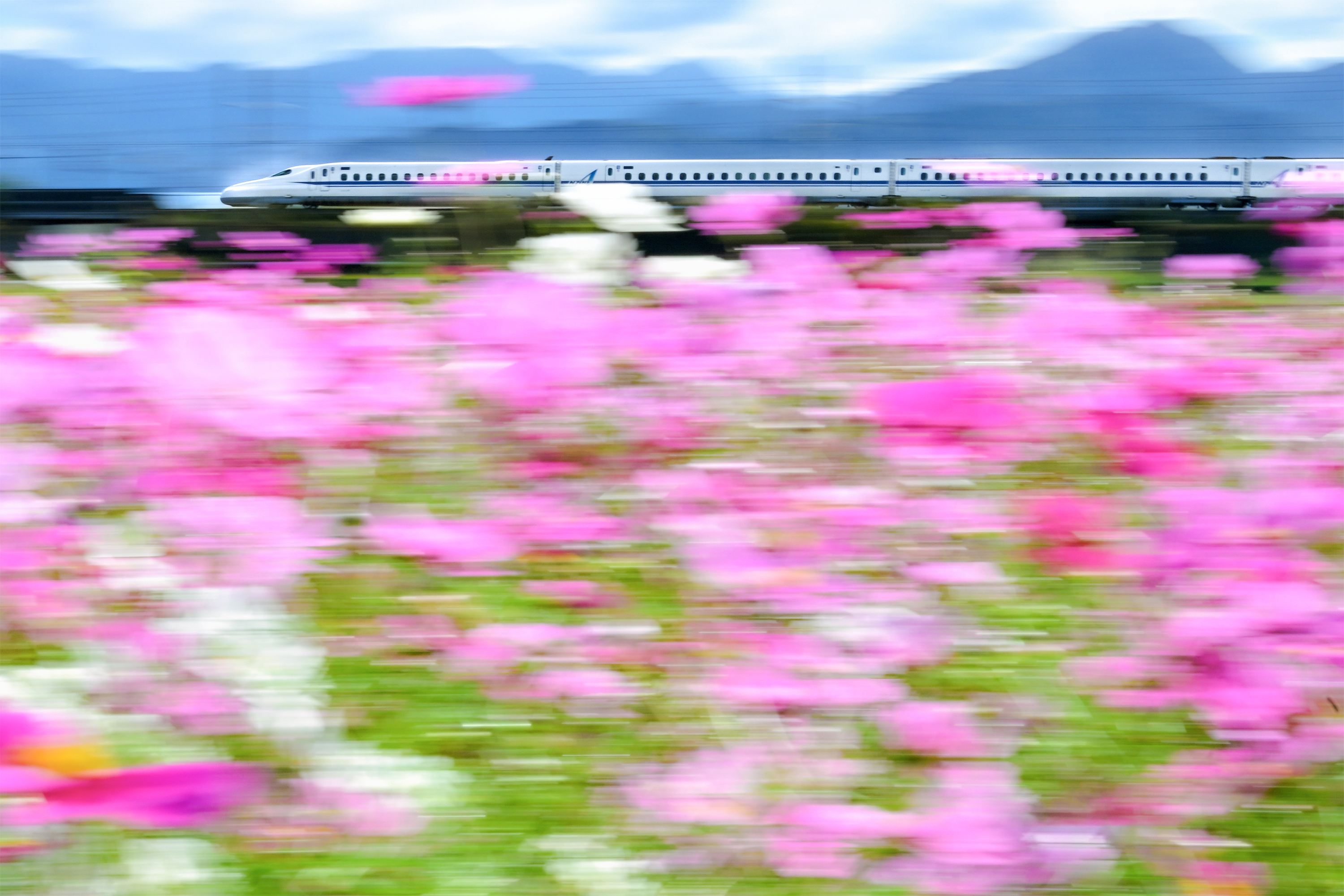 投稿を表示新幹線がコスモス畑の中を走っている光景、まるで夢想の中のような美しさですね。素敵な作品です。^^