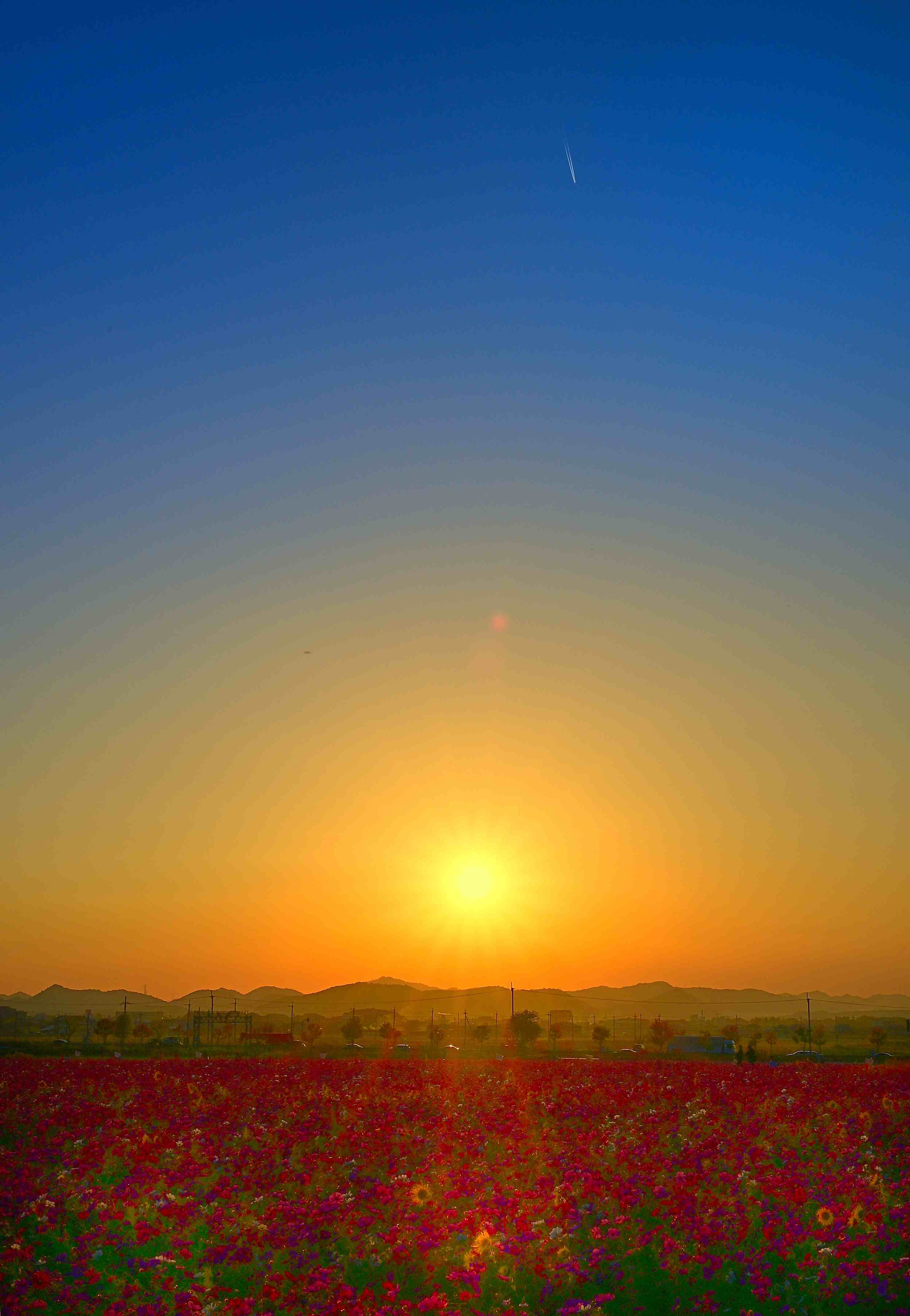 投稿を表示こんなに澄み切った秋の空があるのですね~。空からコスモス畑までのグラデーションがとても美しいです。飛行機も飛んでいて清々しい作品ですね。^^