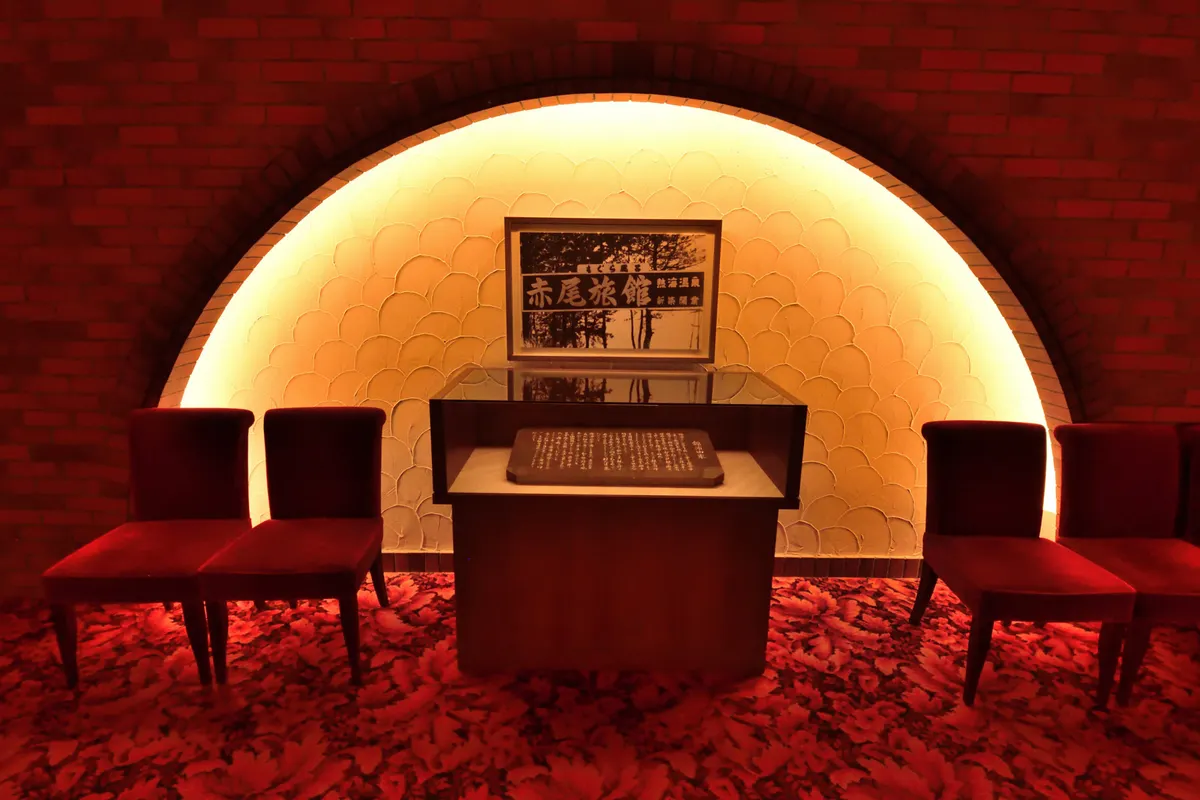 熱海のホテルニューアカオのメインダイニング錦に続く回廊です。ホテルの歴史を紹介する写真が並んでいます。