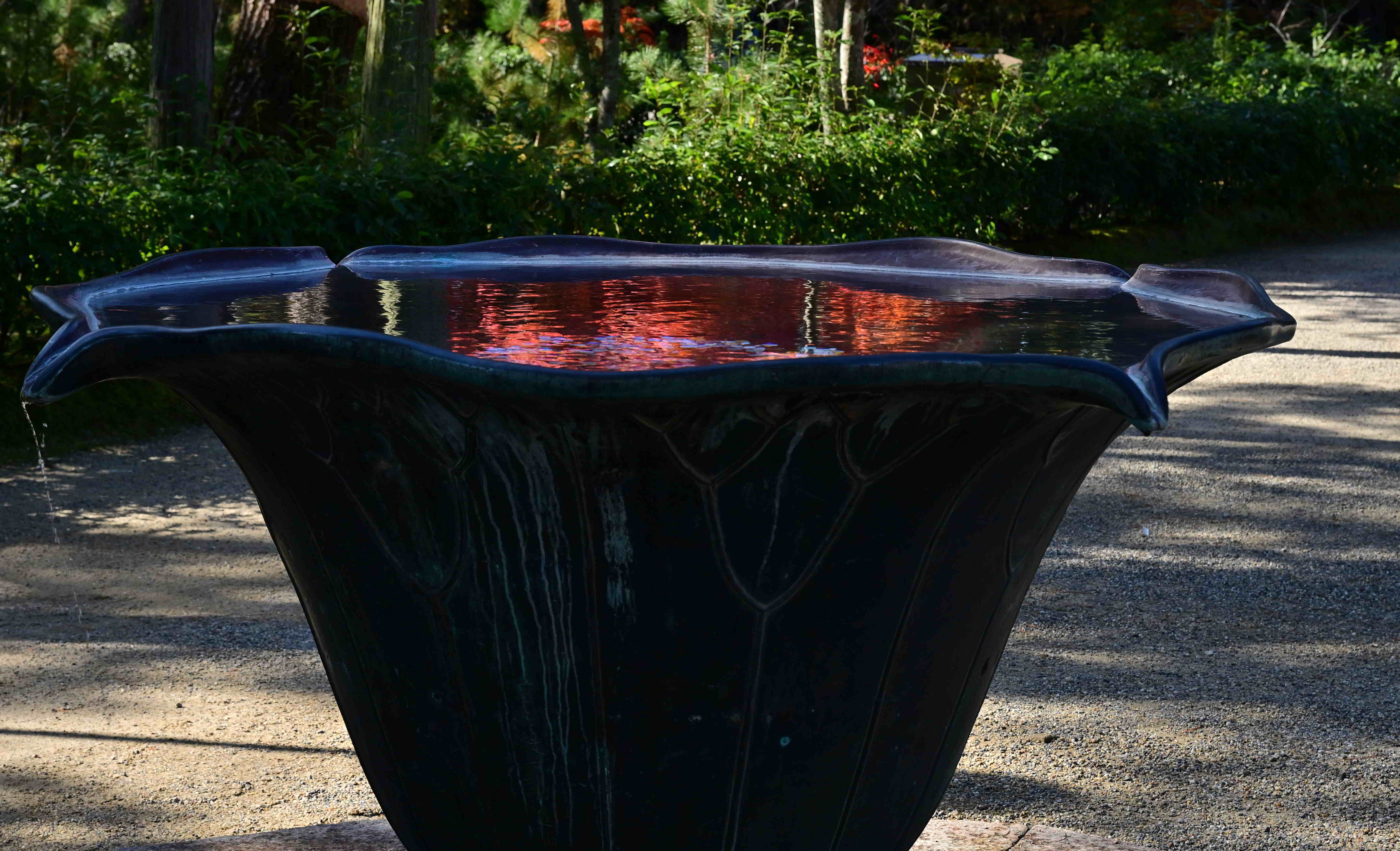 唐招提寺の手水は端から水が滴っていますが、水量を上手く調節しているので、水面はいつも凪状態で上手く映り込むよう仕掛けています。そこに紅葉の赤がさりげなく秋を主張しているようで