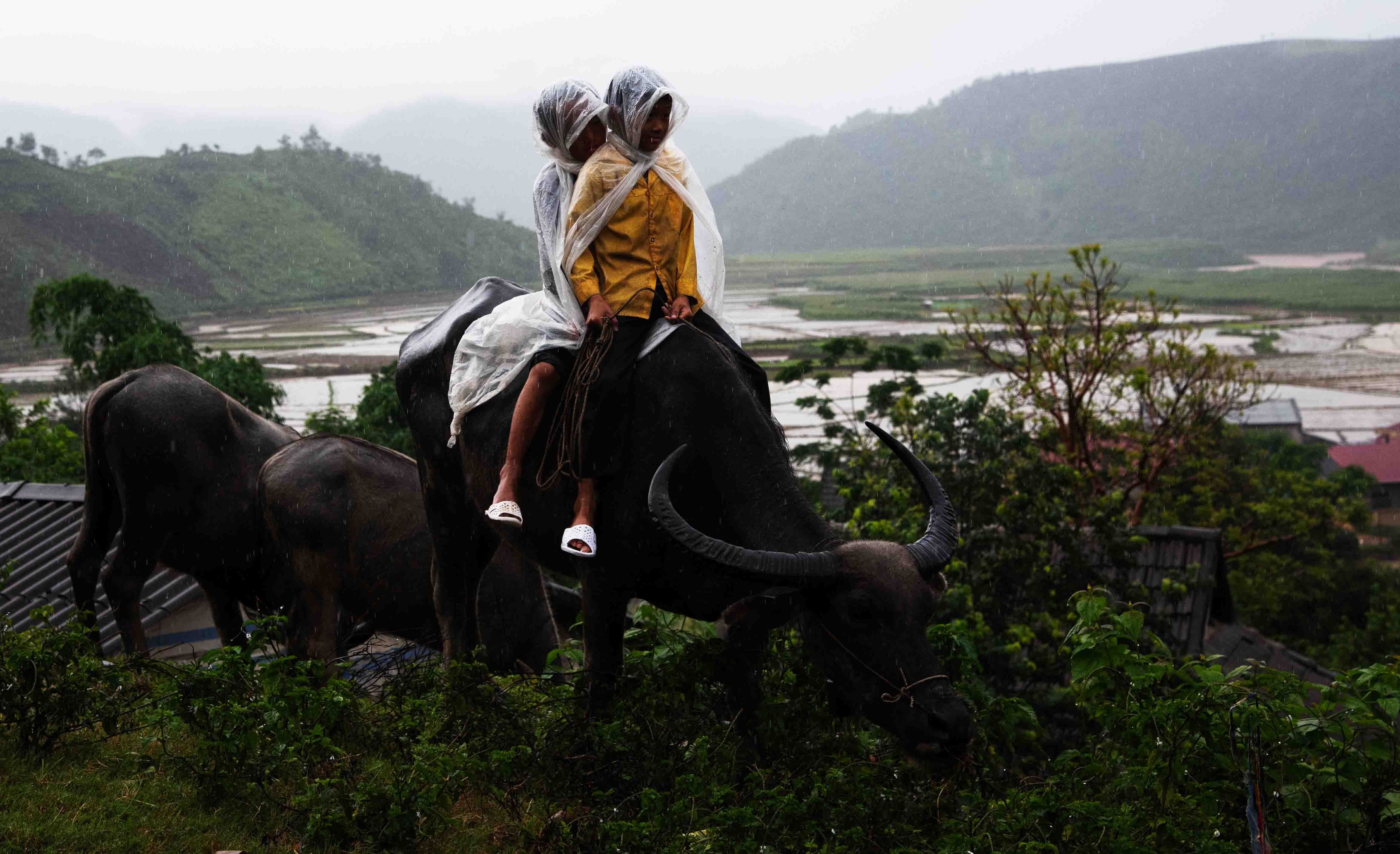 投稿を表示水牛にまたがる子供達、逞しいですね。雨も降ってるようですし、ものともせずお手伝いをしているのですね。いいショットです。