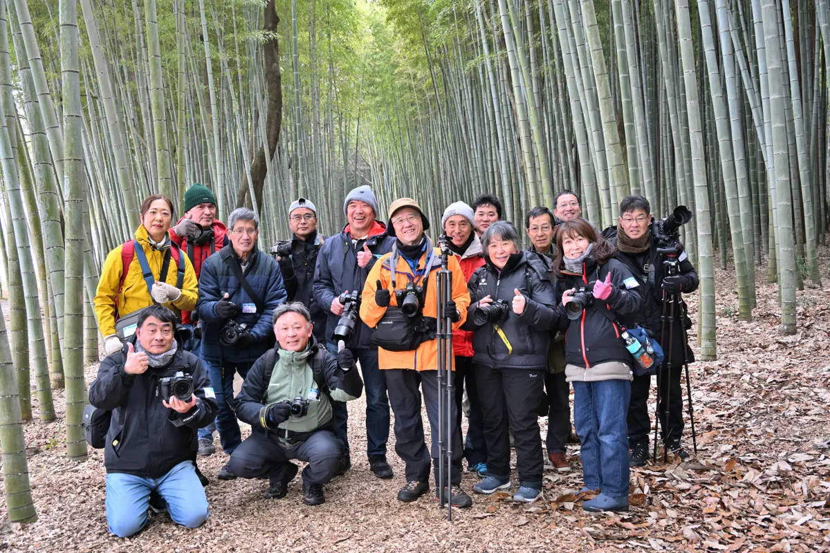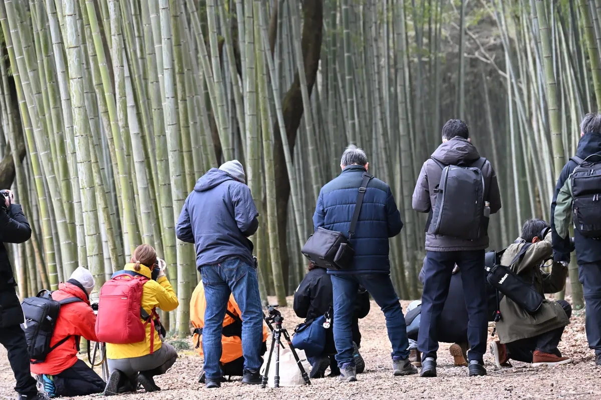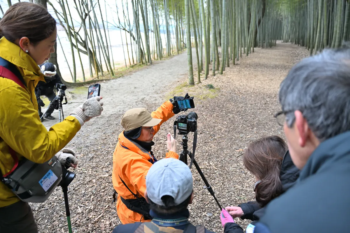 三好先生もこれまで数多くの竹林を撮影されてきましたが、「ここの竹林はトップクラスの美しさ」と太鼓判を押されていました。京都にも全国的に有名な竹林がありますが、観光客が多く、腰を据えて撮影するのはなかなか難しいのが実情です。しかし、この散歩道は人通りが少ないため、参加者の皆様はそれぞれ納得のいく構図をじっくり探し、思い思いの角度からシャッターを切ることができました。