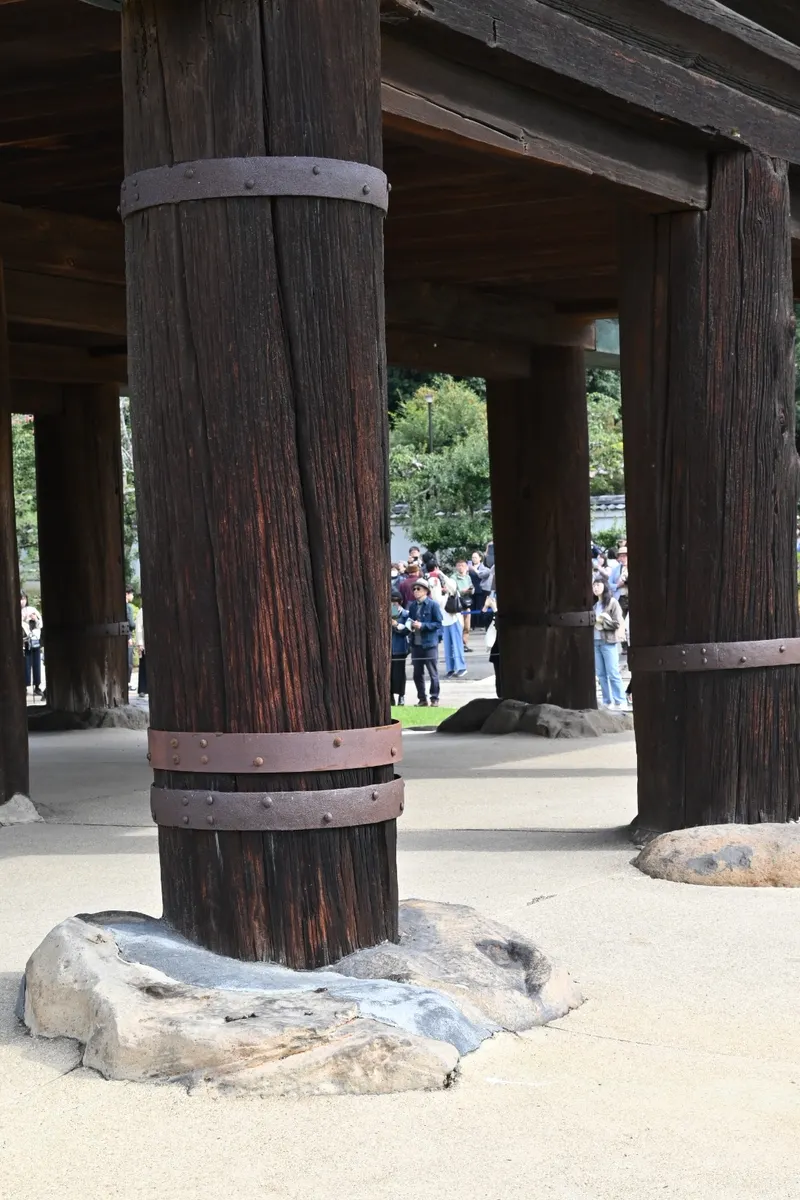 宝物を守る工夫として高床式をが有名ですが、その基礎石の凸凹に合わせて柱の底を削って建てられています。↓