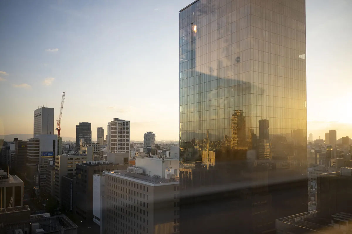 ニコンプラザ大阪の窓から。 向かいのビルに景色が映り込んでいました。