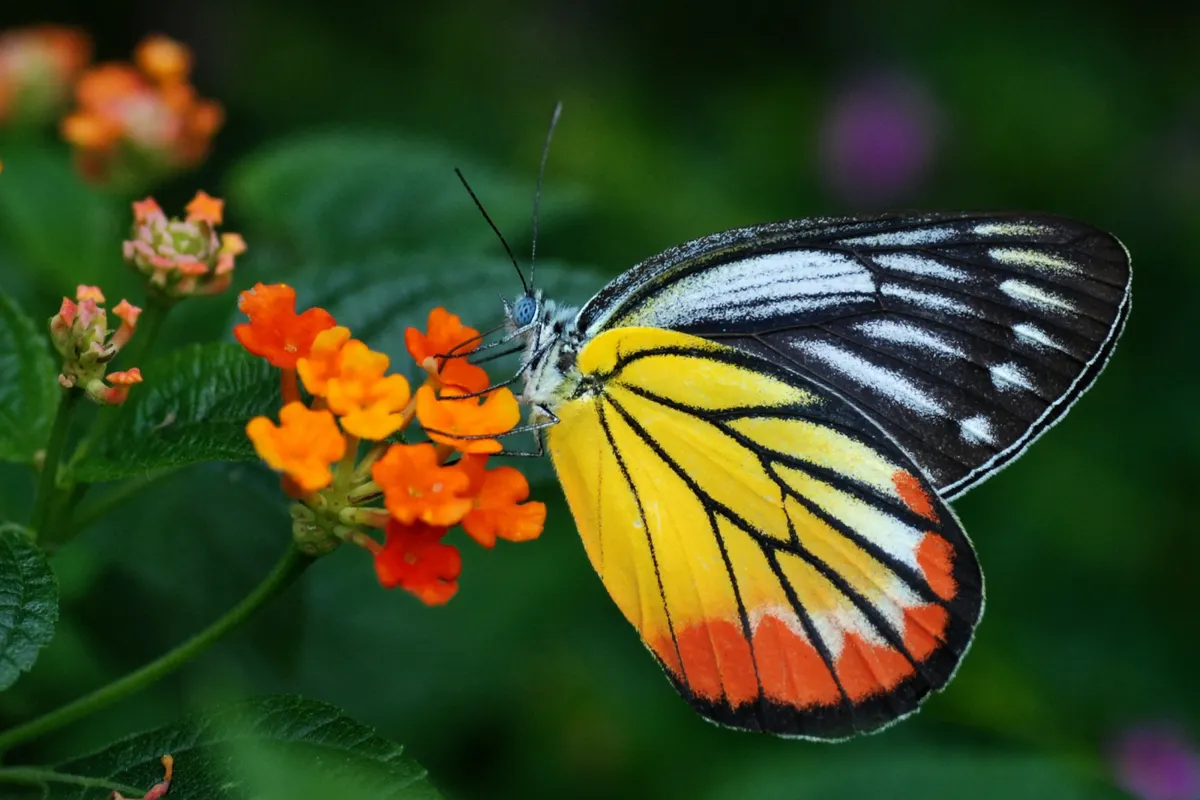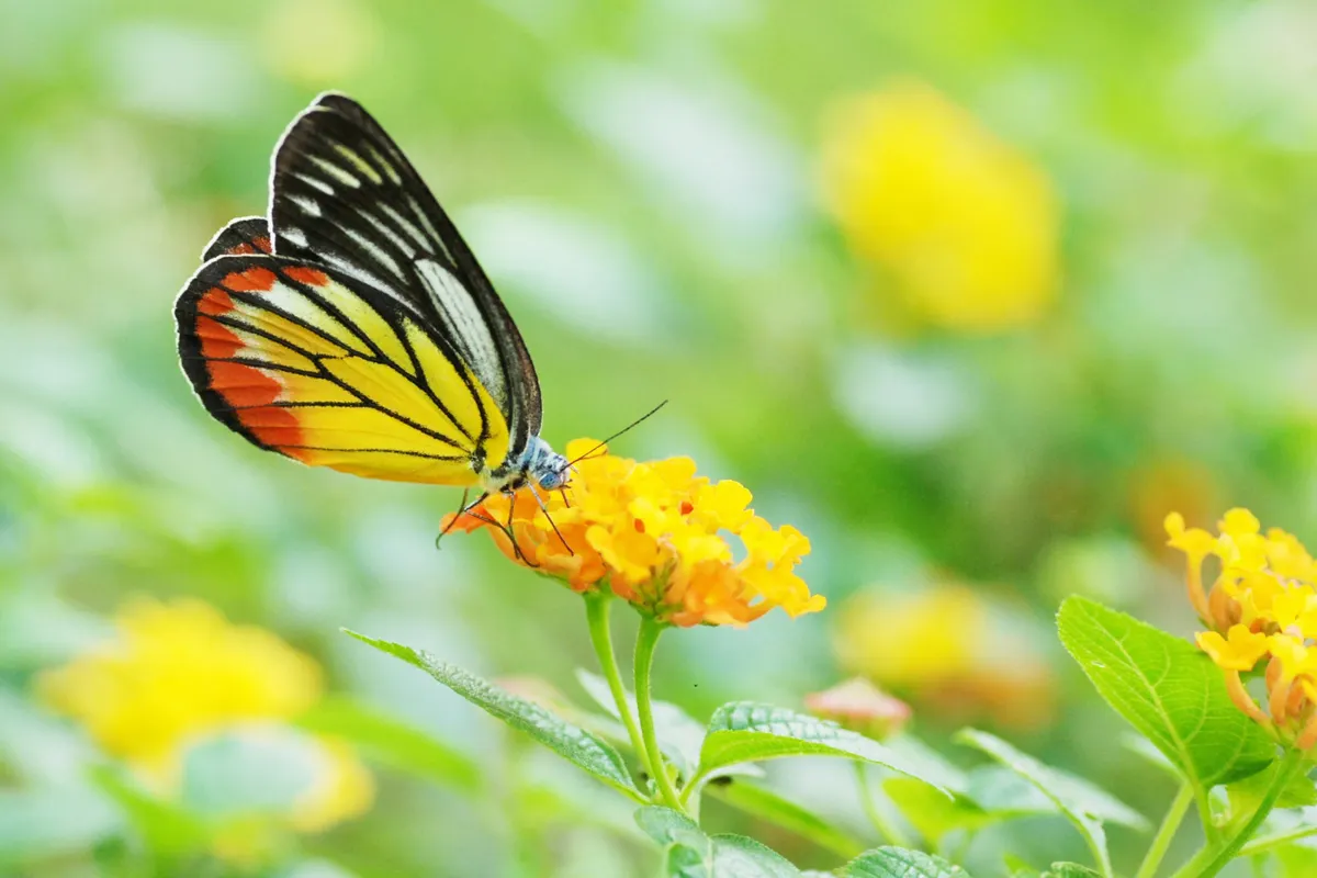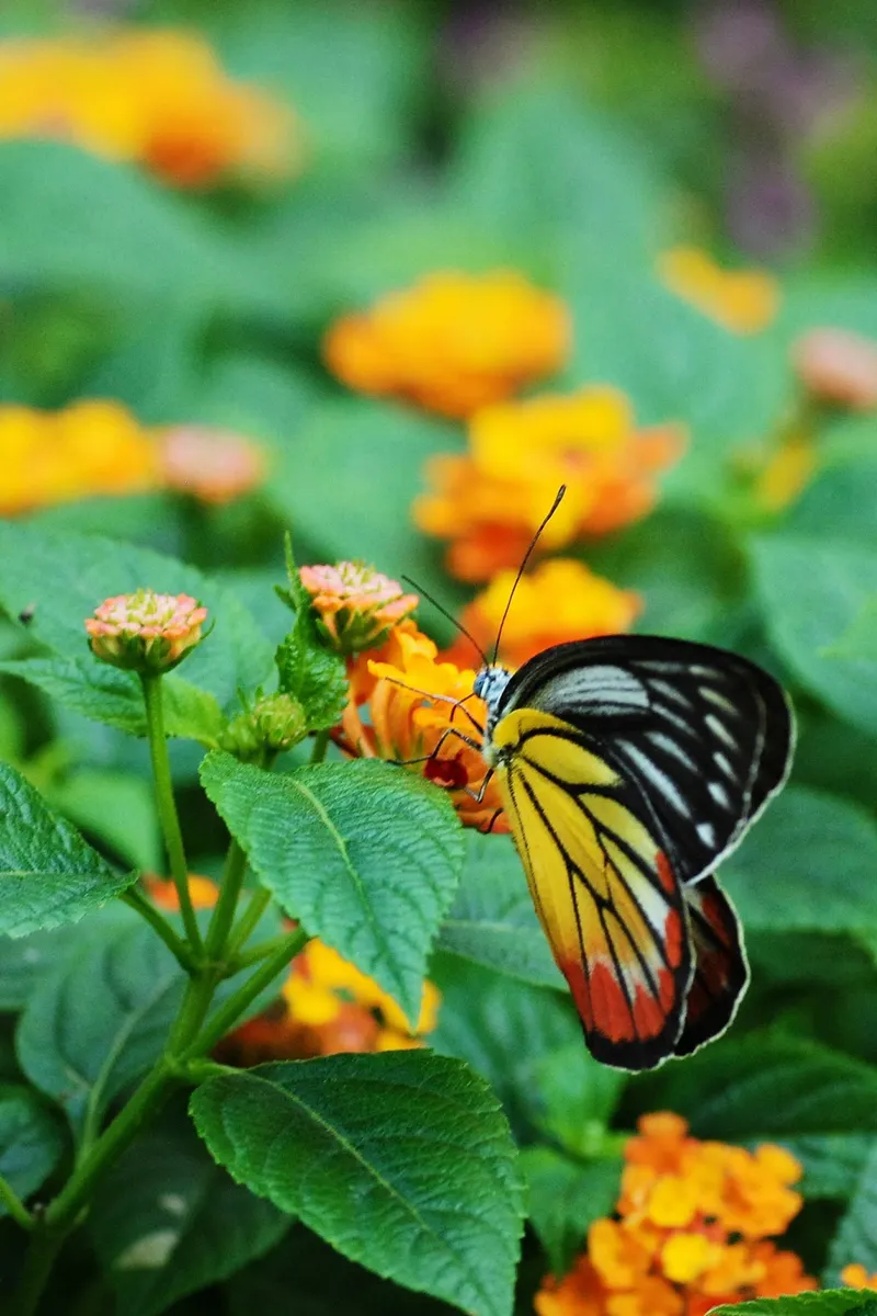 写真はカザリシロチョウと花の黄色が美しく調和して且つ手前の赤い花の前ボケがより一層奥行き感を出していて素晴らしい作品になっていると思います。