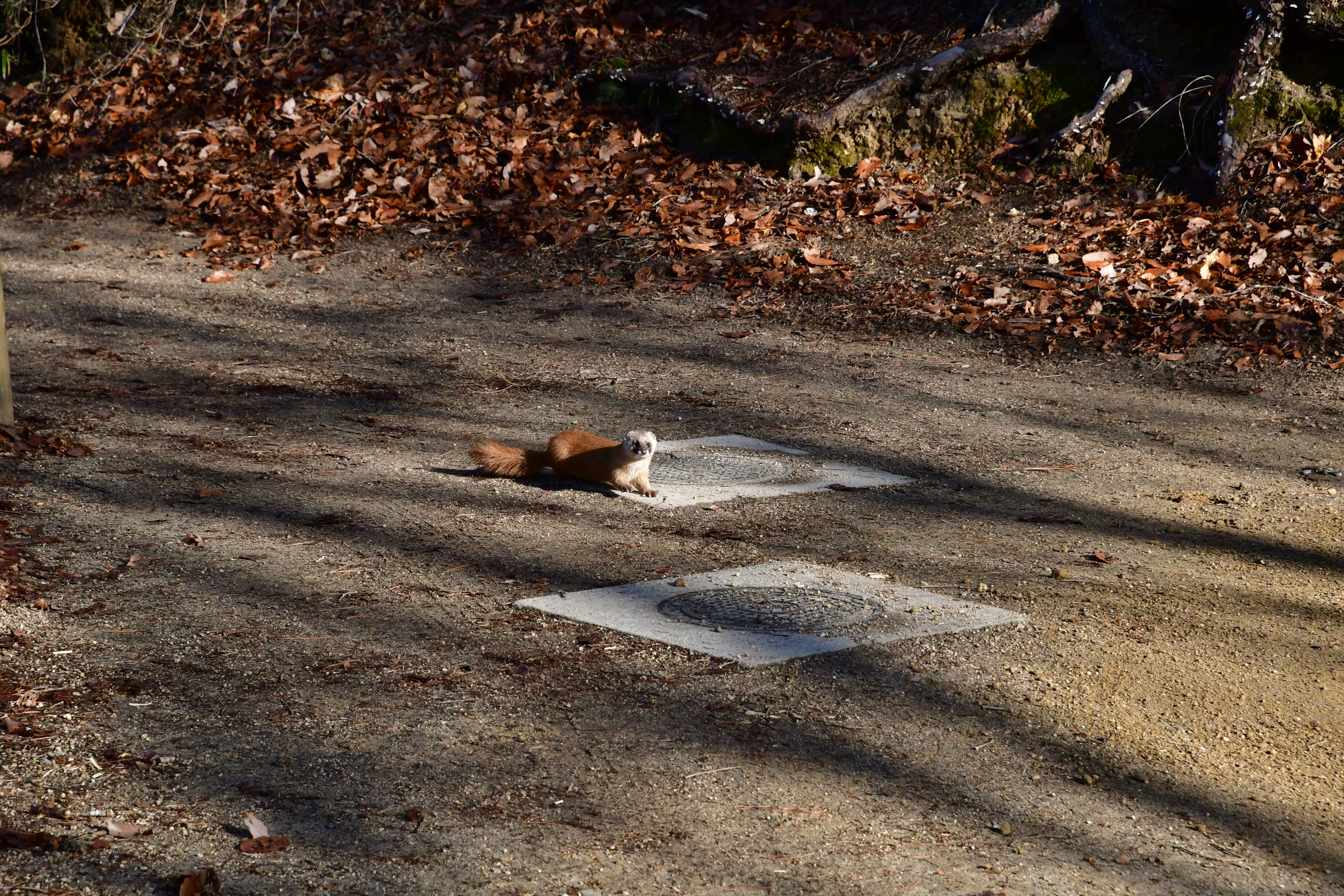 何時も俊敏に逃げ回る鼬がまるで友達のように近寄ってきて、座り込みじっとこちらを見ています。距離5メートル。お伽話しにある恩返しの鶴や浦島太郎の亀の体験をさせられるのか、一瞬頭の中が錯乱するもパチパチと数枚撮影。長いレンズを装着していたため、これ以上は寄れない。顔をくっつけてもOKだったかもと悔やむ。