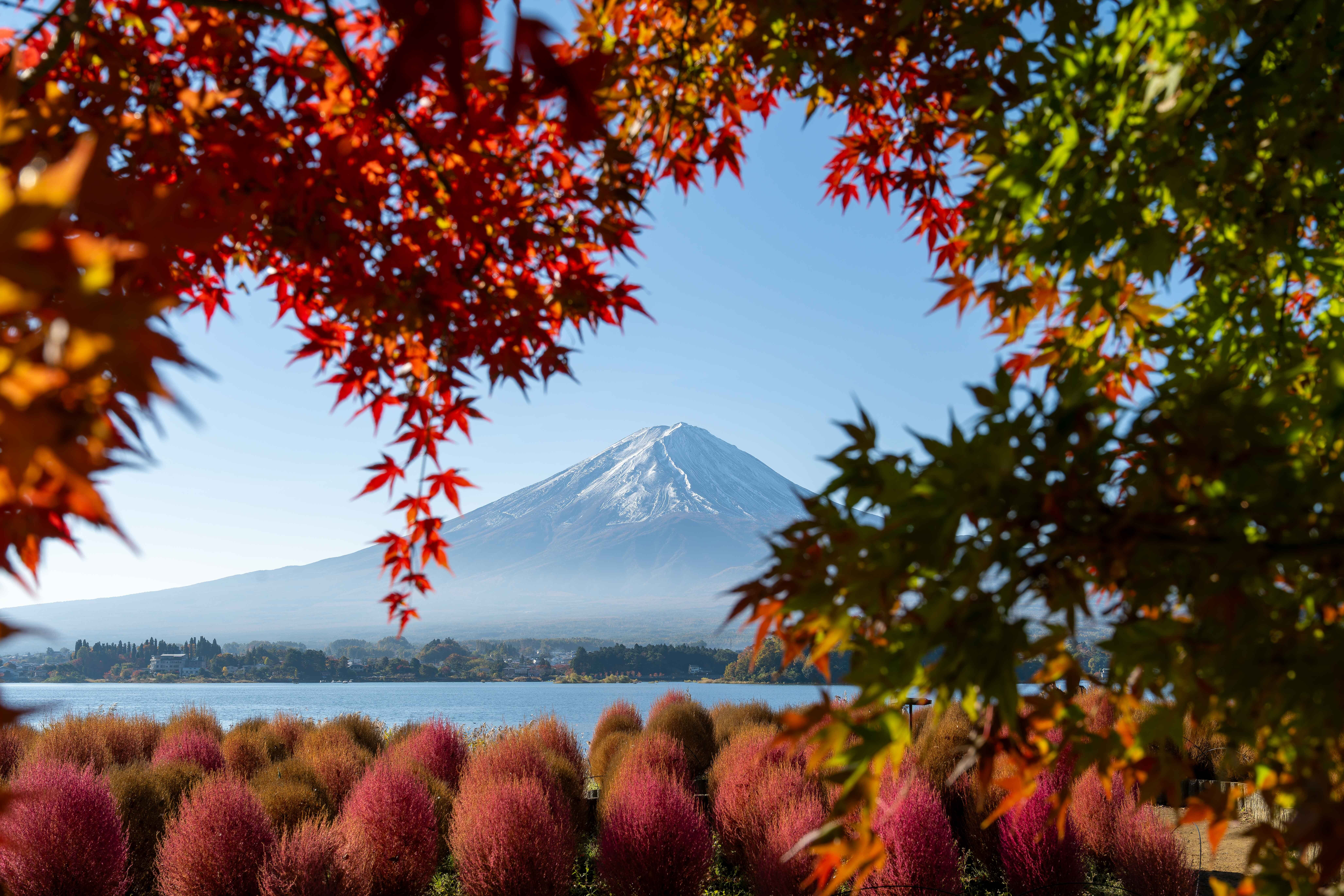 投稿を表示コキアと紅葉に富士山の姿は、とても贅沢な秋の光景ですね。素晴らしい作品です。^^