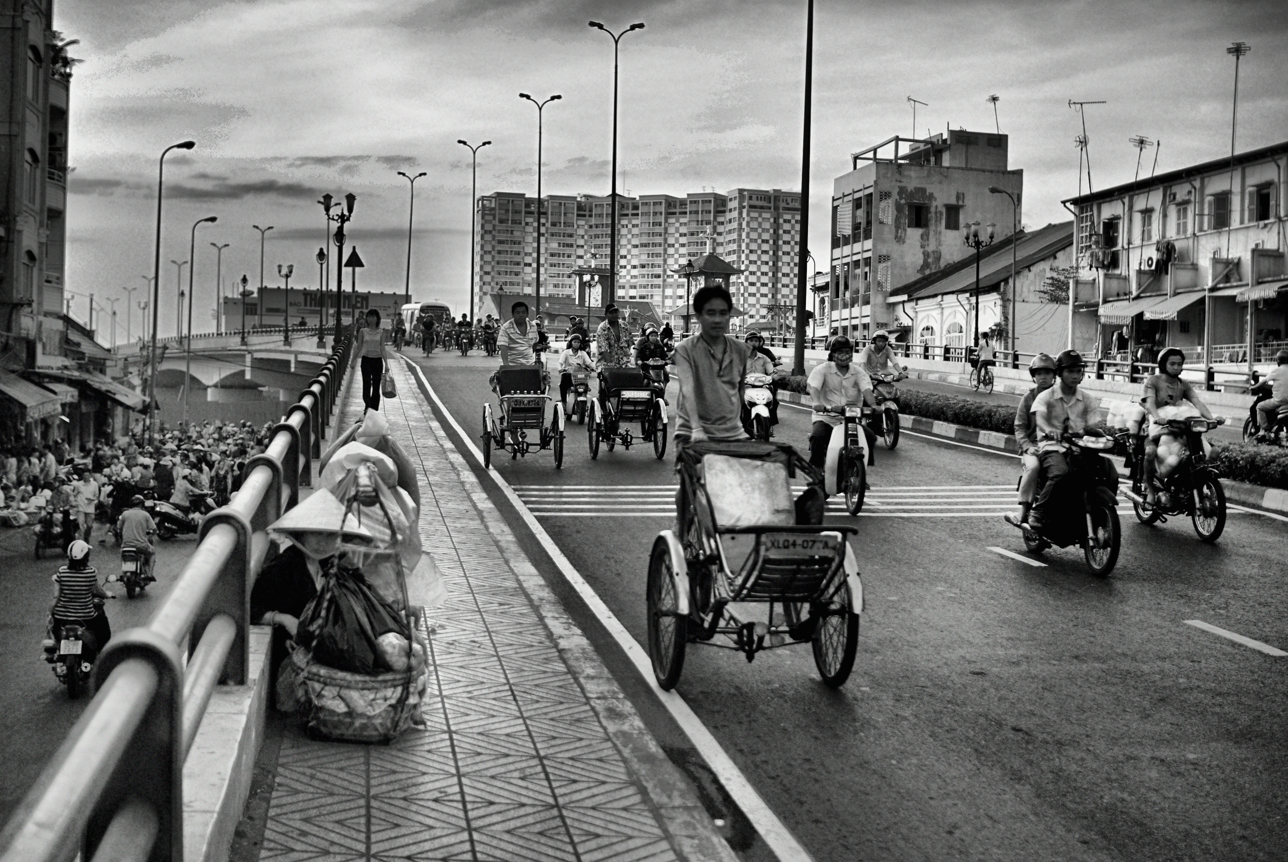 トップ > メンバーズ・フォト > 街風景 > 長い橋の光景 Finder 2026/01/13 09:23 長い橋の光景 ベトナム・ホーチミン市に在住中に撮った作品です。ホーチミン市1区と6区を結ぶ橋の上で撮ったショットです。早朝に6区から賑やかな1区に仕事の向かう人達です。ベトナムらしい光景かなと思います。左に座っている人は天秤棒を担いで物売りをしている人たちですが、長い勾配の端で疲れて一休みしている様です。 ベトナム ホーチミン市 いいね 共有する 共有する X facebook LINE リンクをコピー コメントする 1 件の返信 (新着順) ミュートしたユーザーの投稿です。 投稿を表示 Hachiro 2026/01/13 10:08 とてもいい風景ですね。昔は日本も棒振りが天秤棒で荷物を担いでいましたね。あれは難しくて中々バランスが取れないんです。私も練習しましたが満足に担げませんでした。 いいね 返信する ミュートしたユーザーの投稿です。 投稿を表示 Finder 2026/01/13 15:42 Hachiro Hachiroさんも天秤棒を担いだ経験があるのですね~。日本も昔は、こんな光景があったのですね。シクロと天秤棒、ベトナムの街並みに溶け込んだ光景です。その時代を映した光景ですが、何十年後には、貴重な写真になっているかもしれません。天秤棒の必要のない経済、社会になって欲しいものです。^^ いいね 返信する