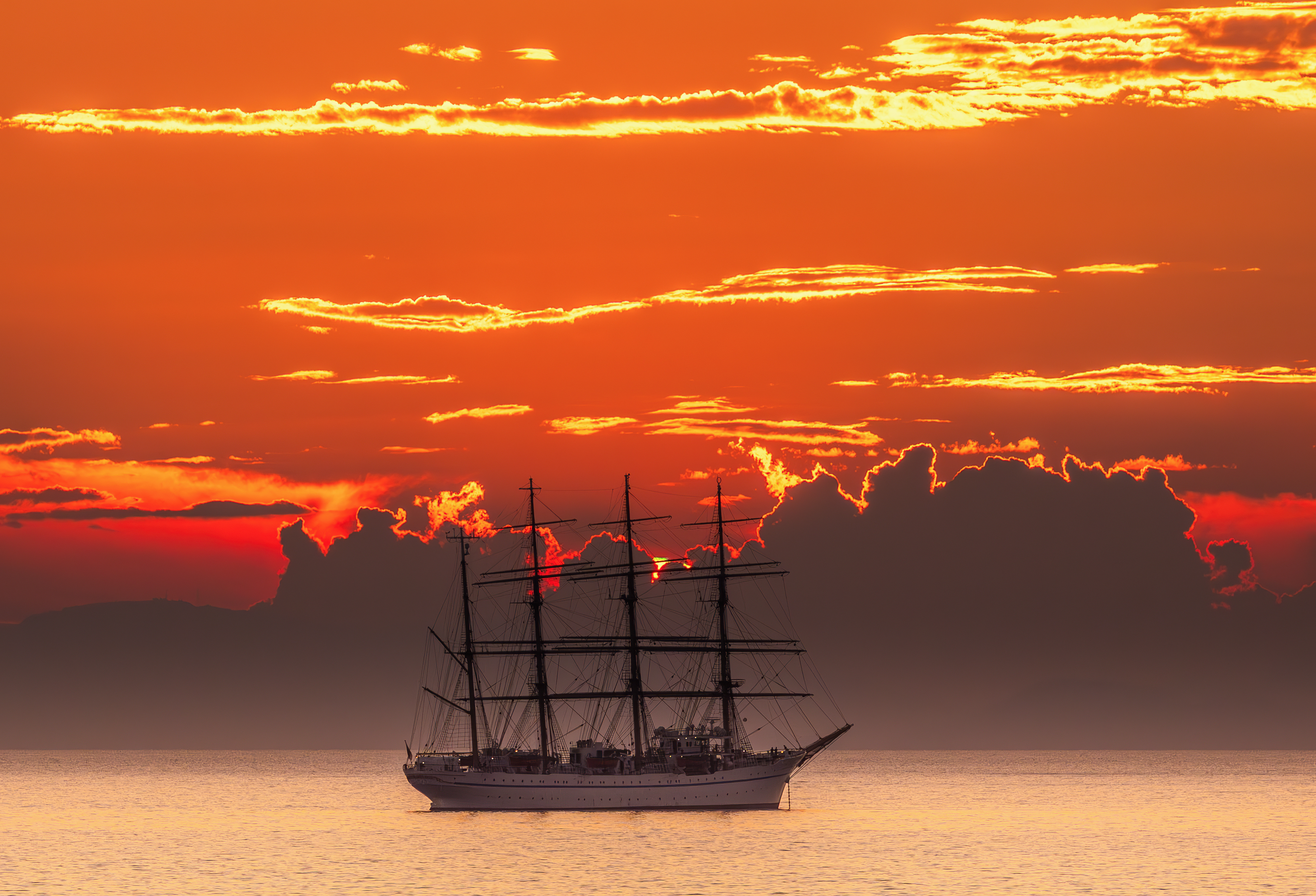 はっきりと写る帆船に真っ赤な空。