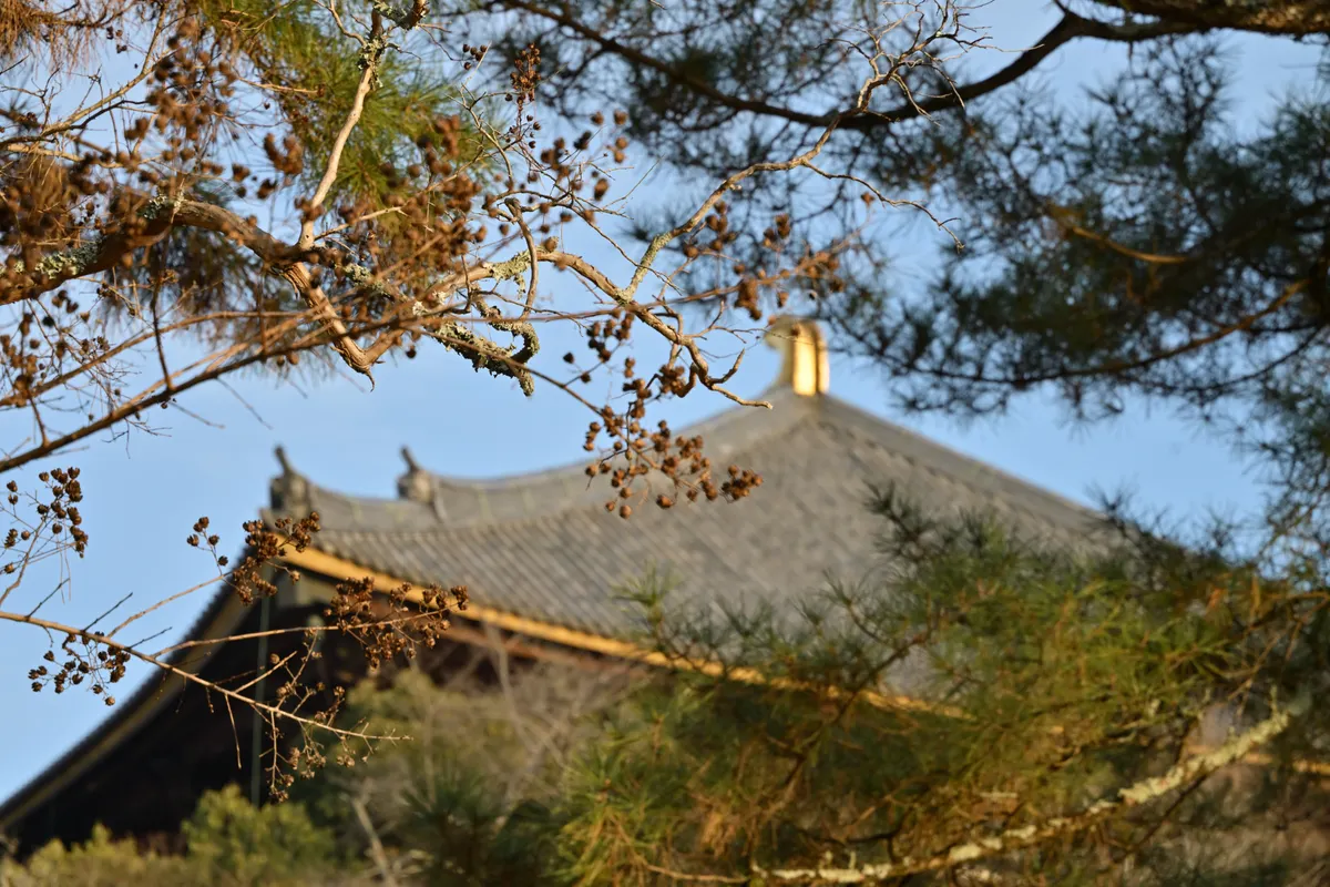 二月堂までてくてくと歩いて向かうと、右手には東大寺の大仏殿の屋根が見えて来たのでパチリ。