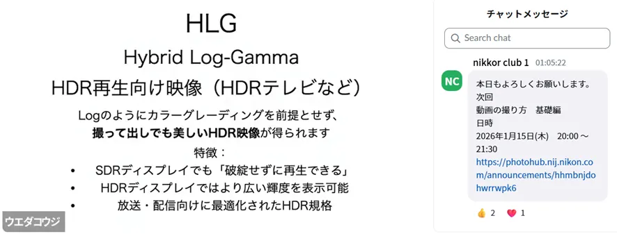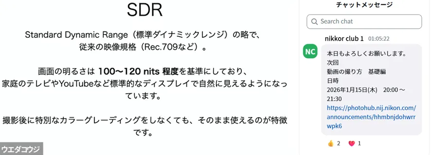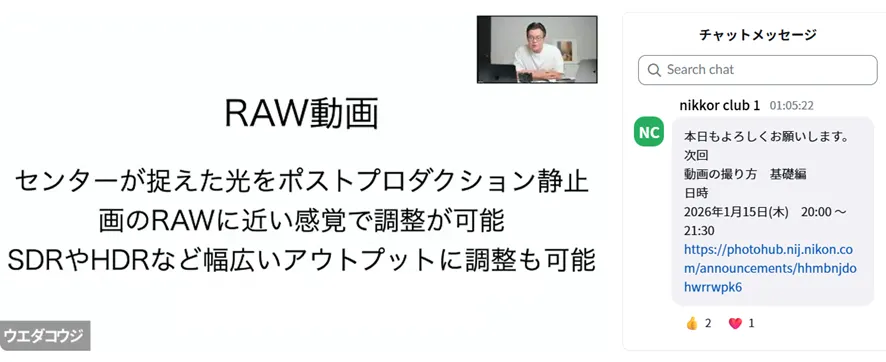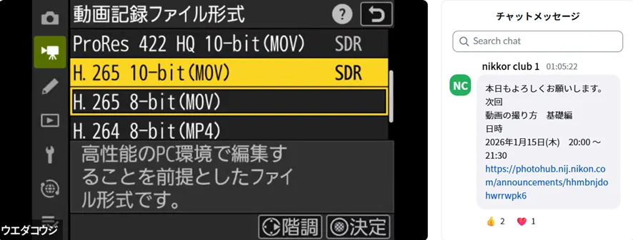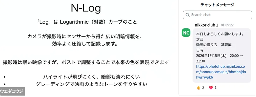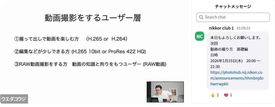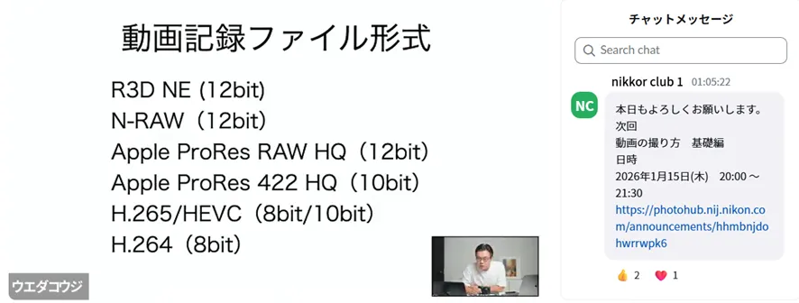 また、上田先生から「ニコンのカメラは見たままの世界に近い映像が撮れるため、デフォルトの設定はビデオライク寄りである」というお話がありました。セミナーでは、こうした基本的な考え方から、動画用語の詳しい解説へと進みました。今回はNikon ZRを使用してご説明いただきました。