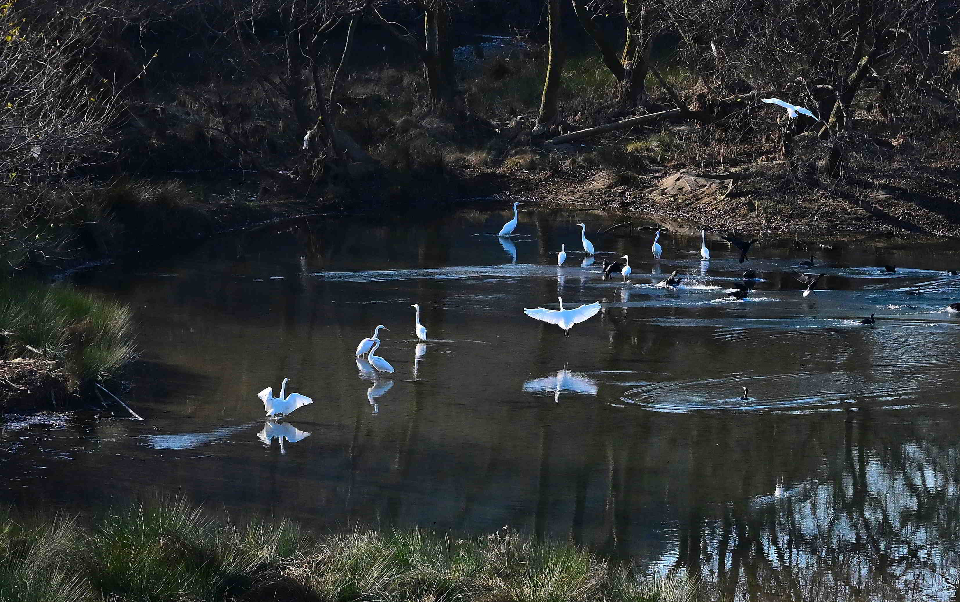投稿を表示私が見ている場所では、ほとんどが単独行動の姿ばかりですが、こんなに沢山の白鷺が集まる場所があるのですね~。カワウさんも一緒なのですね。きっと豊かな自然に恵まれた場所なのですね。素敵な光景です。^^