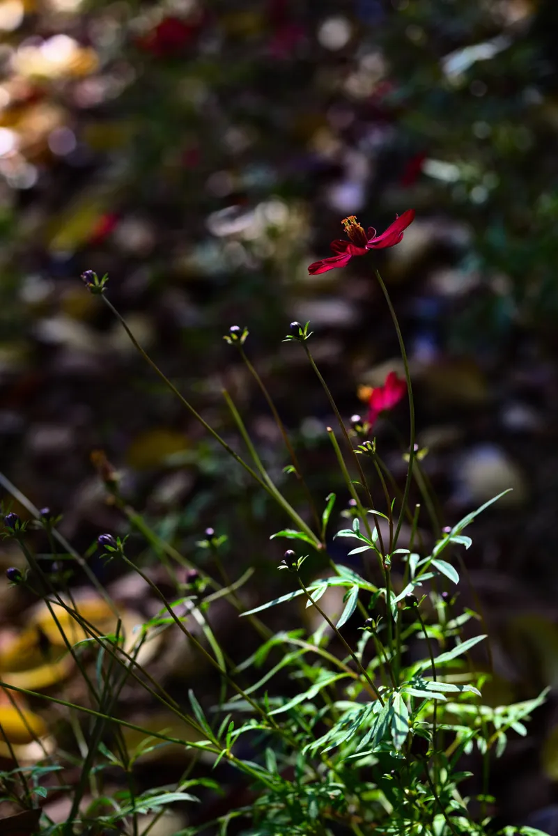 赤茶色に近い濃い深紅の花びらがとても美しいコスモスです。