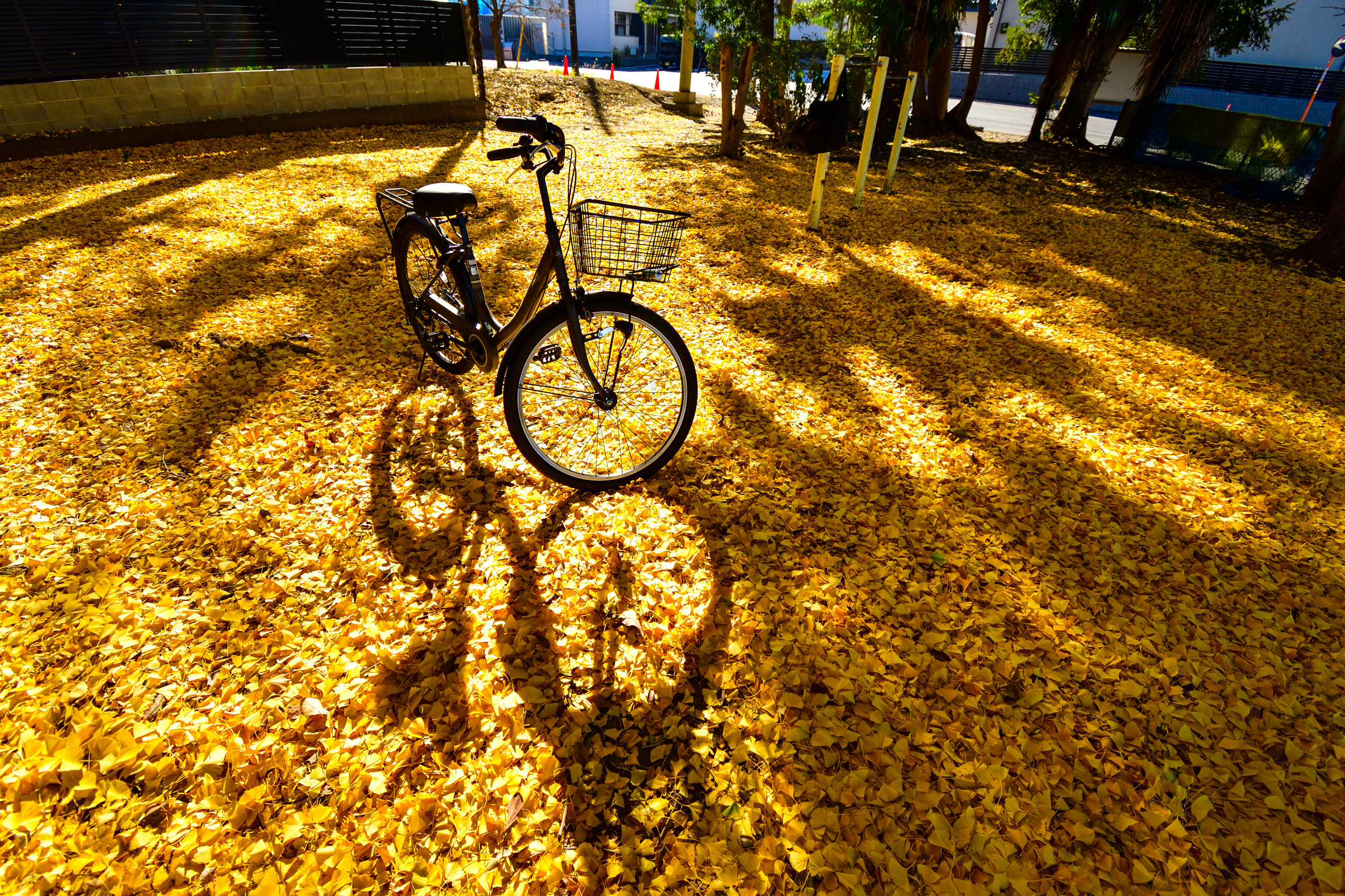 投稿を表示イチョウの毛氈と自転車の長い影。良いですね。秋そのものですよ。
