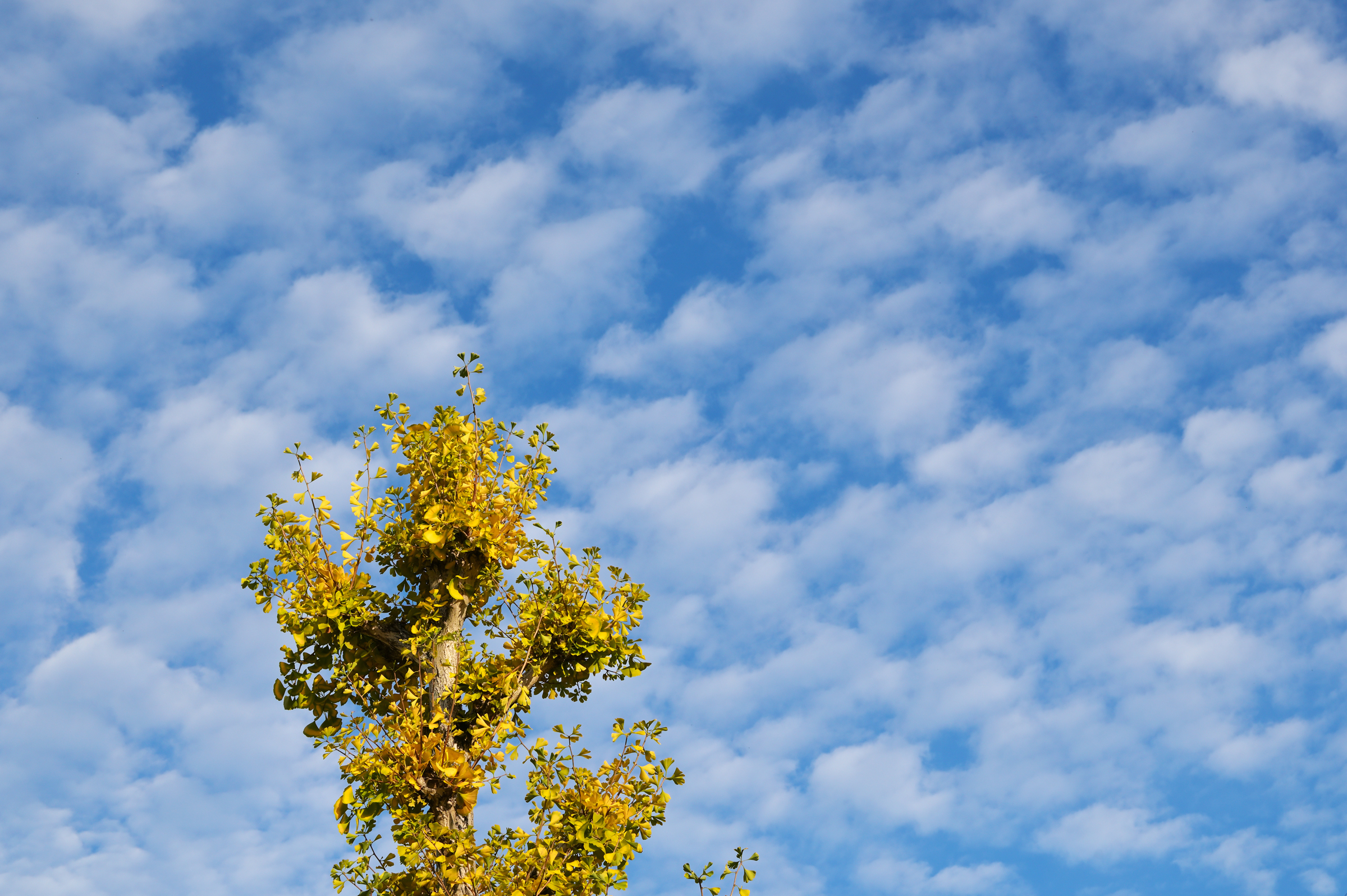 伸びる雲が空の広大さを表現していて、そこにたたずむ銀杏の木がどっしりしていて安定感(頼りがい)を感じます。