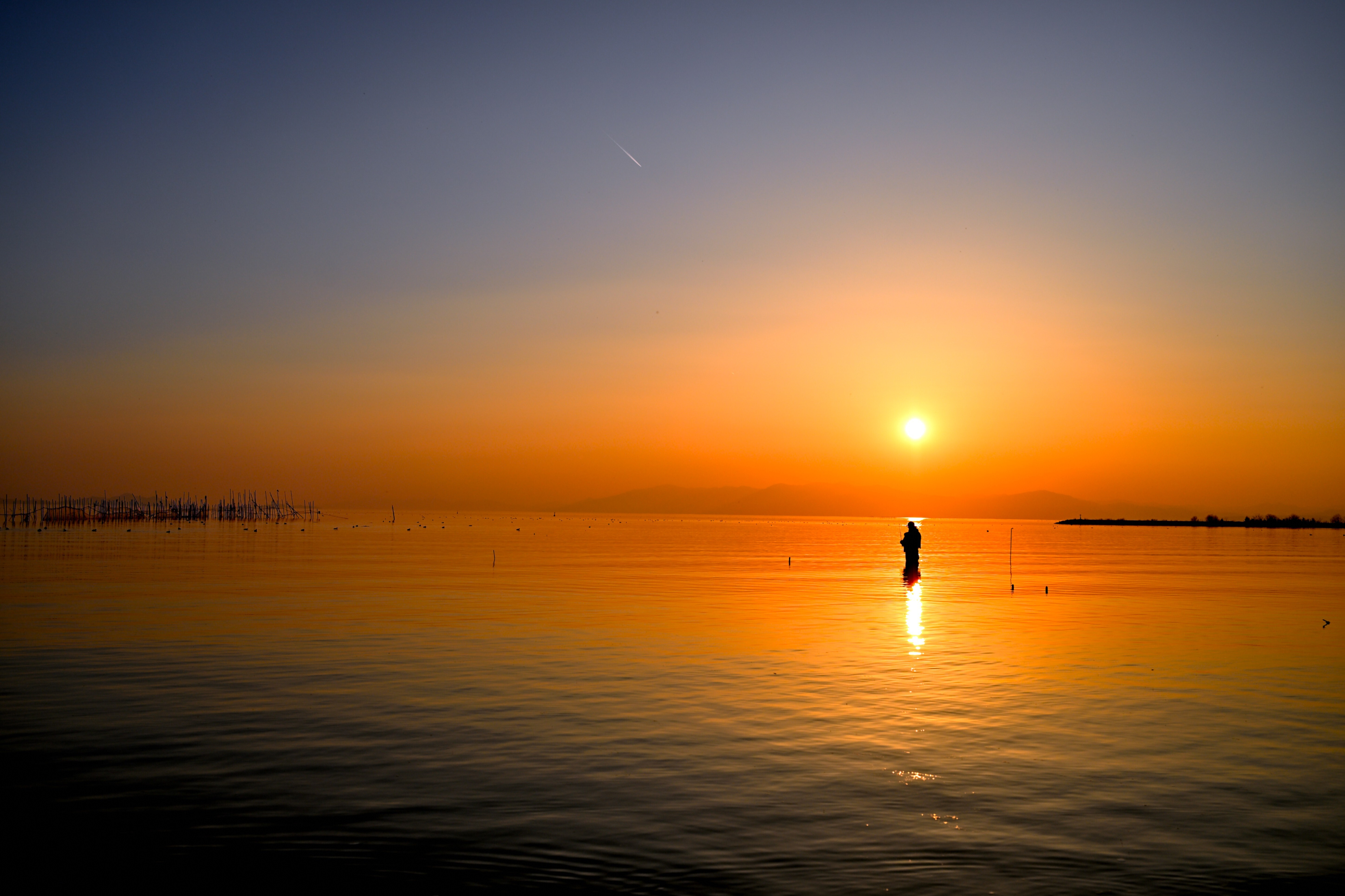 この釣り人は夕日より獲物に集中しているのでしょうか。