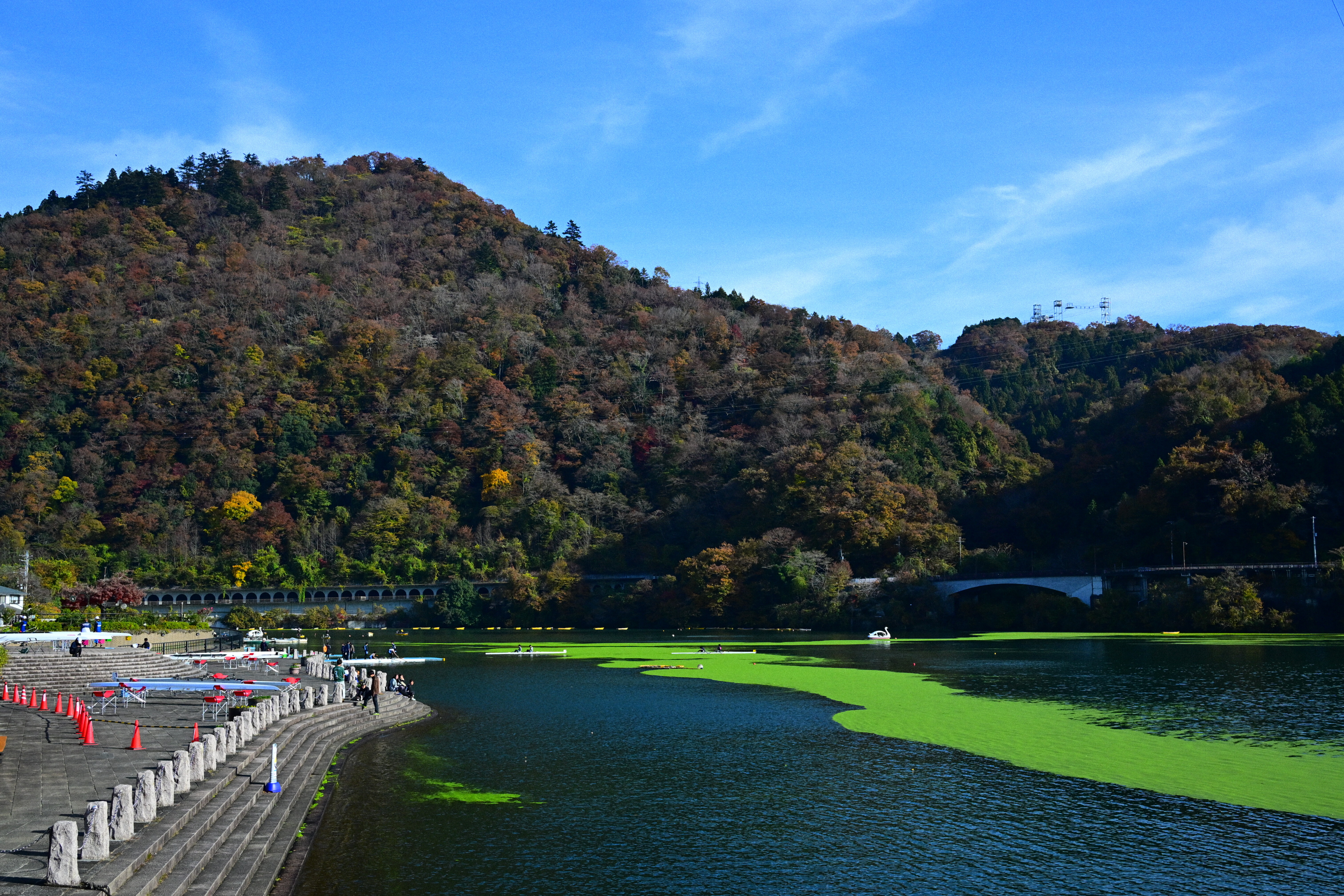 湖面に映える藻なのでしょうか緑の線が美しかったので紅葉と青空を合わせてCPLフィルターで調整しながら撮ってみました。
