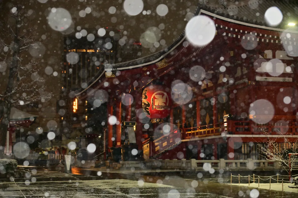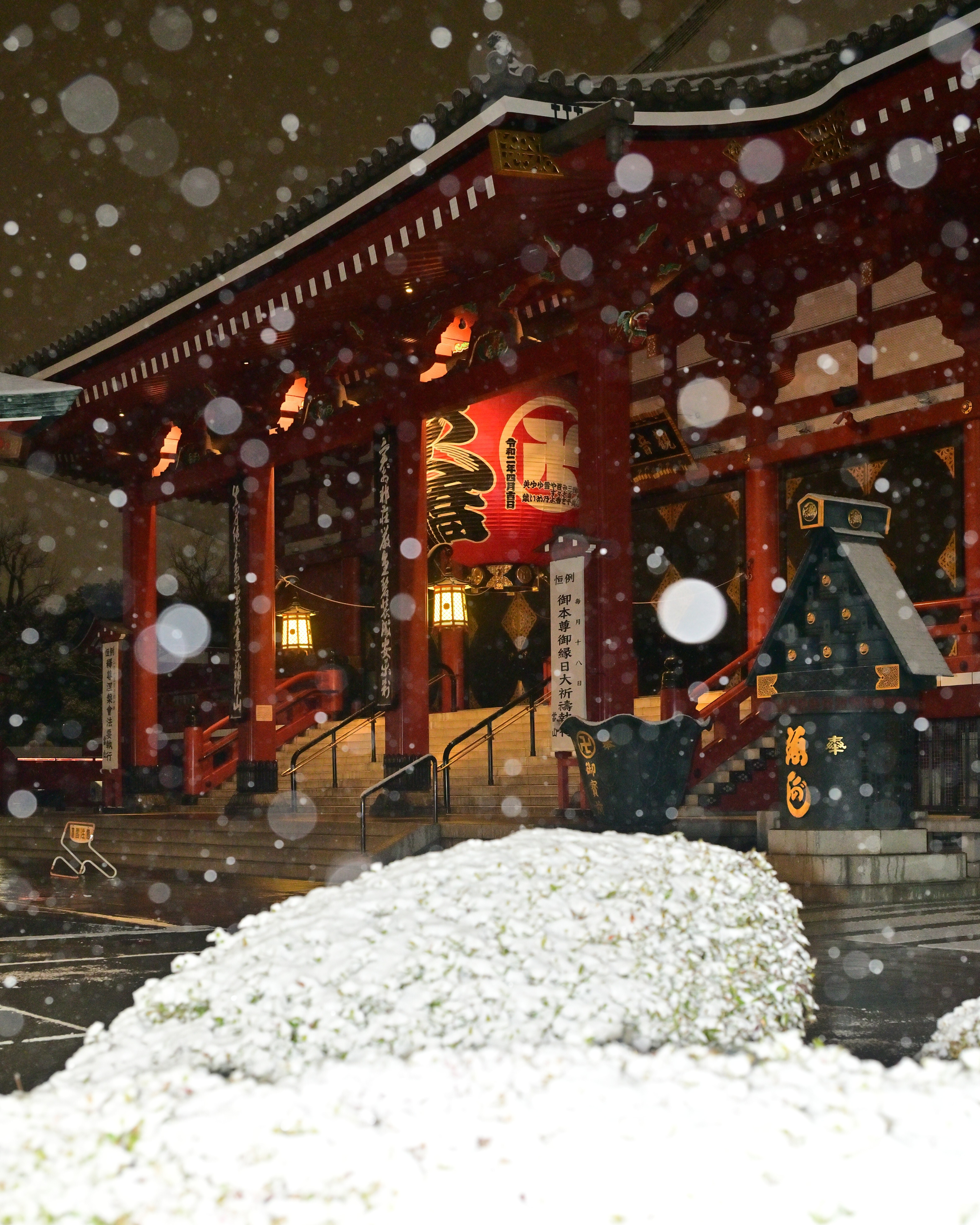 投稿を表示雪の玉ボケが本堂を素敵に見せていますね☺️こういう作品を見るとストロボ欲しいなぁと思います。人のいない浅草寺は趣きありますね。