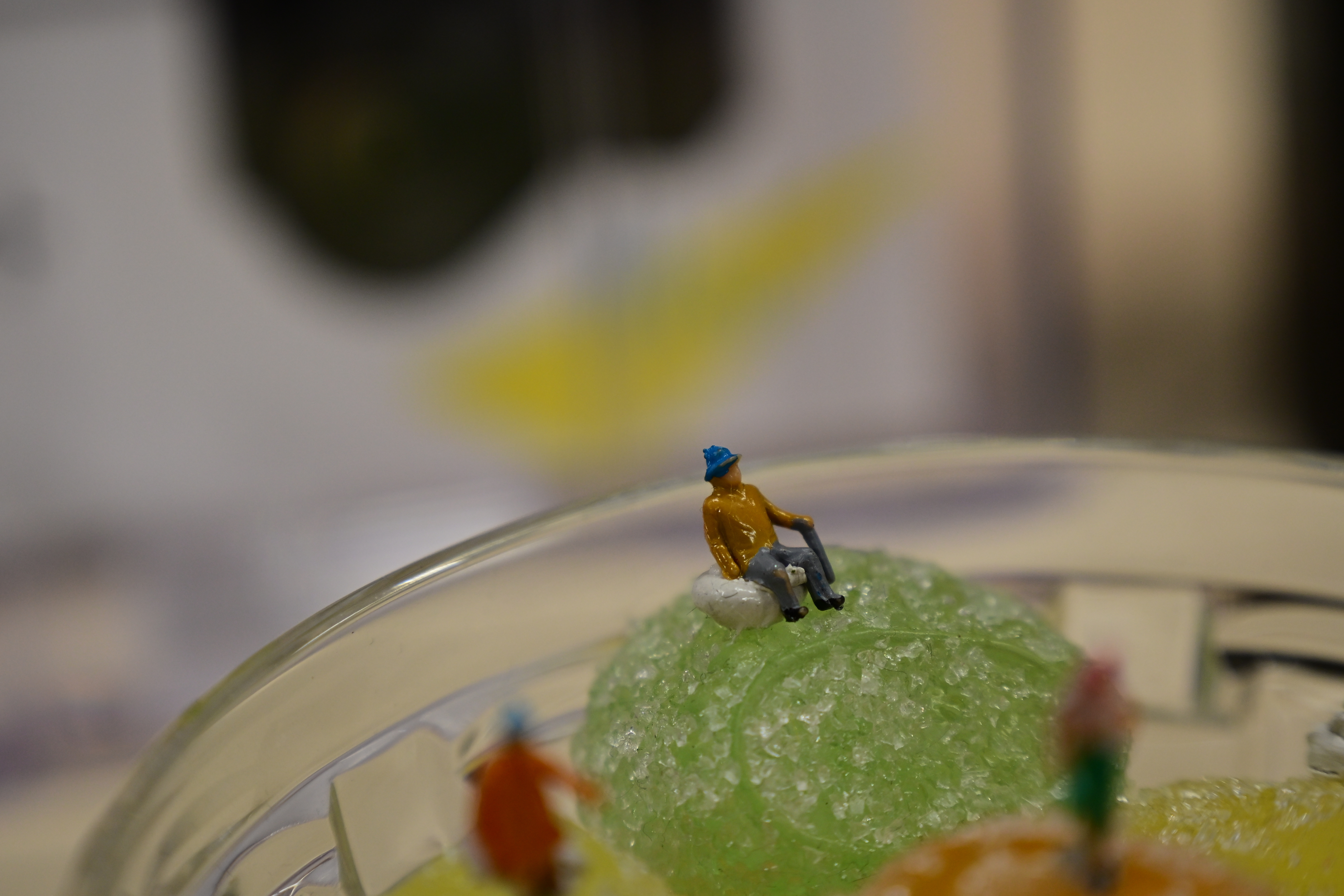 先ずは近接撮影、写真の緑色のものは小さめのイチゴくらいの大きさの上に座っていり人形を撮りました。
