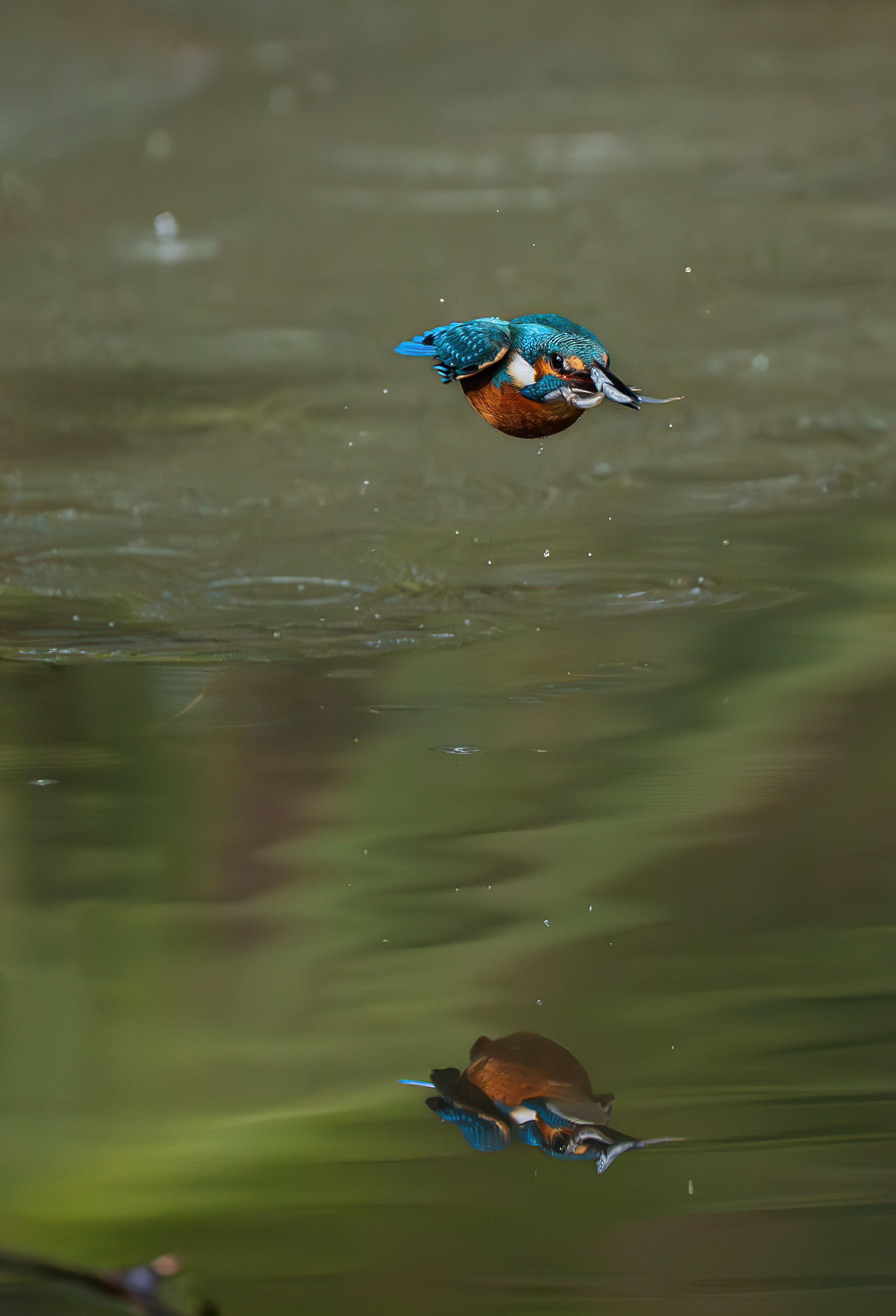 弾丸みたいな姿勢のカワセミ、水面の反射もきれいで、背後が一面みどりで。すばらしい一瞬だと思いました。