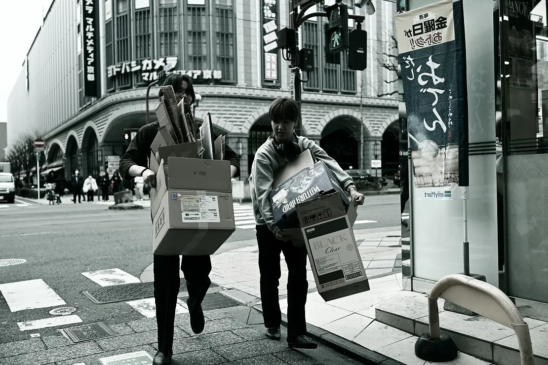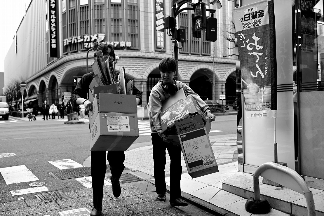 投稿を表示抱えきれない程の段ボールと、足早に歩いてるようなショットにナイスなタイトル