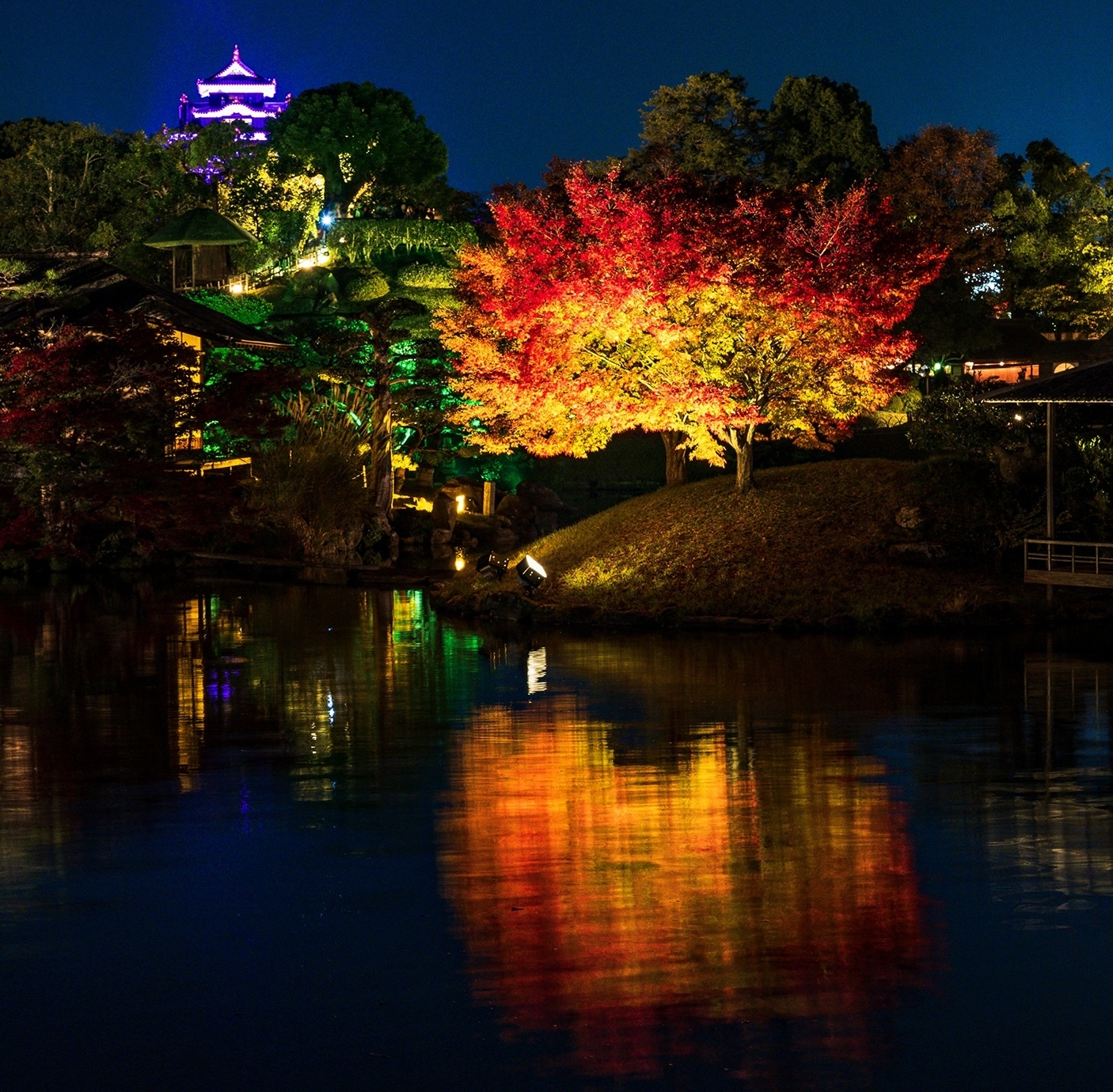 岡山城の青白さが不敵な笑みを、後楽園の温かみのあるもみじのライトアップ。