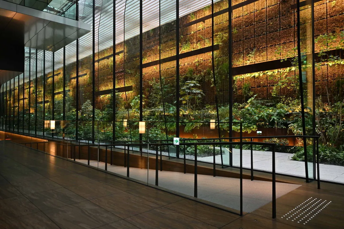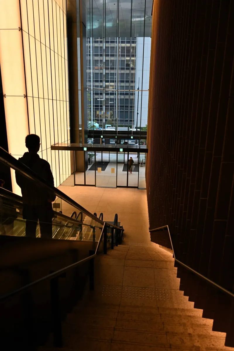 ビルの植栽フロアから新虎通りへと降りるエスカレータです。新虎通りを望みます。