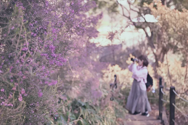 今は河津桜のシーズンということで、園内の装飾品などもピンクに彩られています。わたしはピクチャーコントロールを「メランコリック」に設定して撮影!