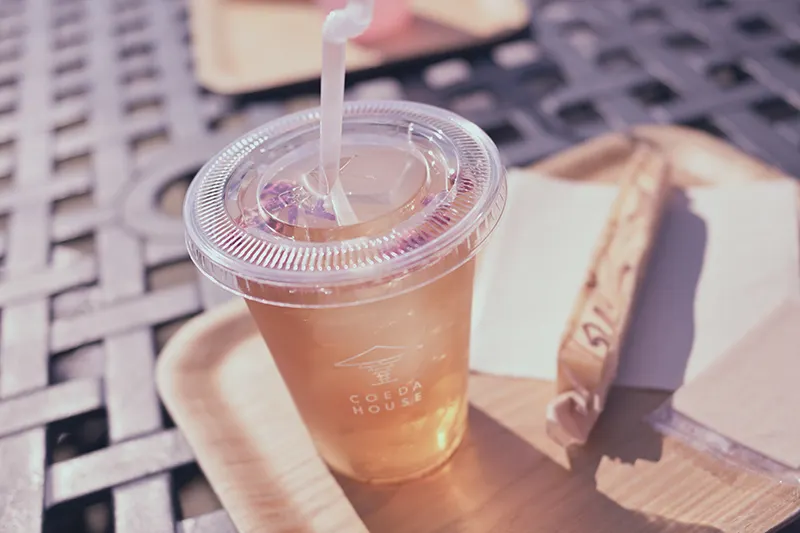 そんなわけで、途中のカフェで休憩。ほうじ茶にもお花があしらわれていました。