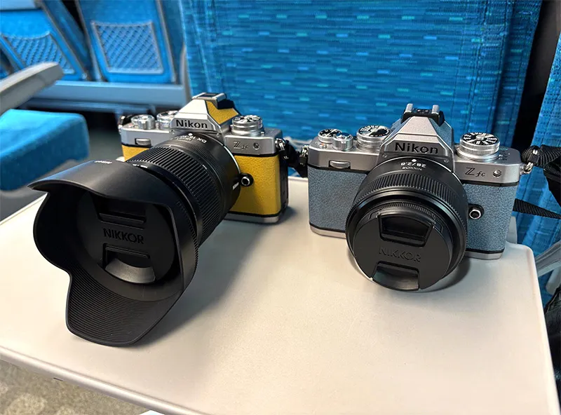 わたしはZfcのシルバー×チョークブルーにレンズはNIKKOR Z 28mm f/2.8、友達はZfcのシルバー×マスタードイエローにレンズはNIKKOR Z DX 16-50mm f/2.8 VRです。お揃いのカメラを色違いで並べて眺めるだけでテンションが上がります🥰