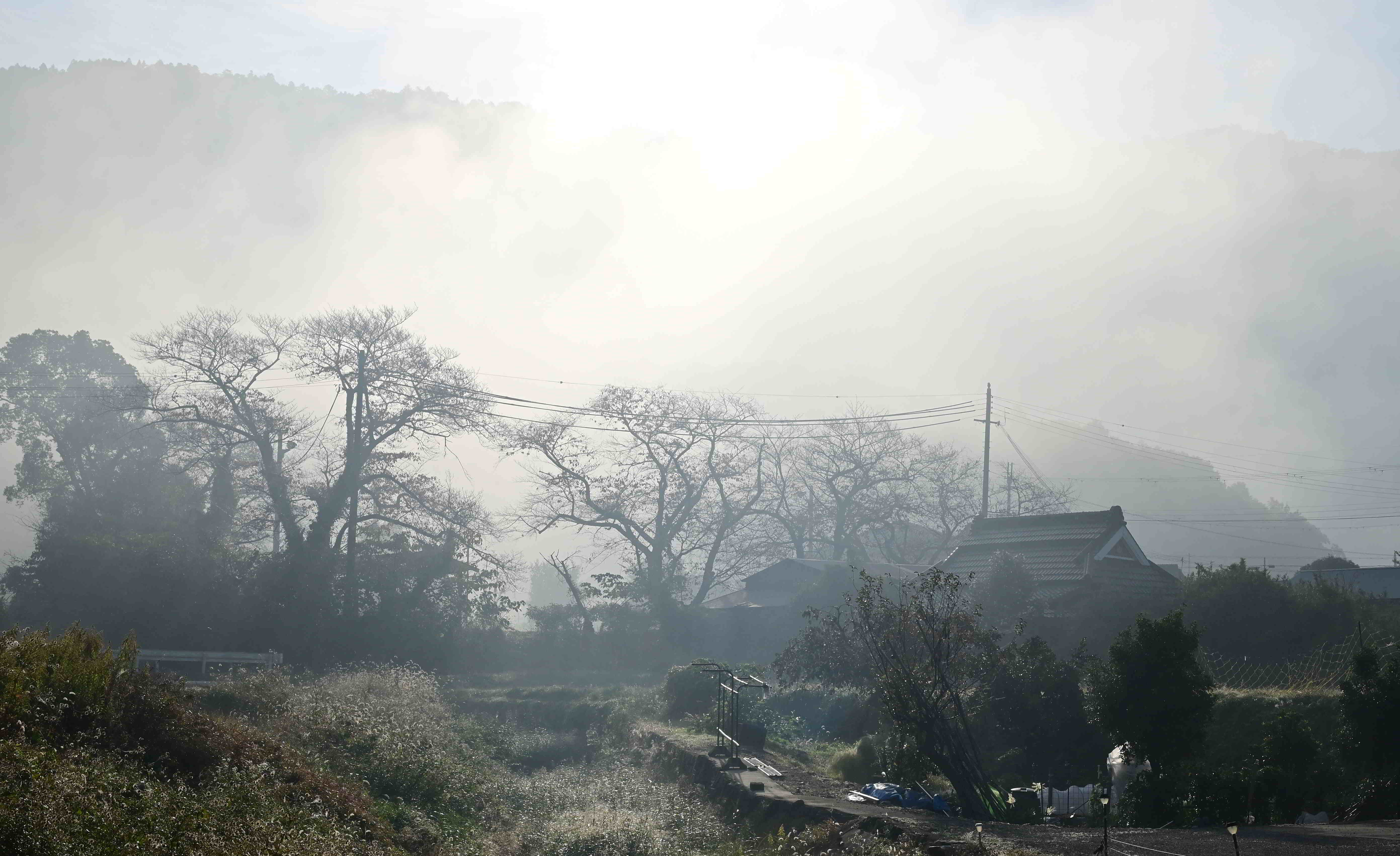 投稿を表示濃い朝霧ですね~。葉の落ちた木々の枝ぶり、瓦屋根の民家の光景がとても美しく感じられます。^^