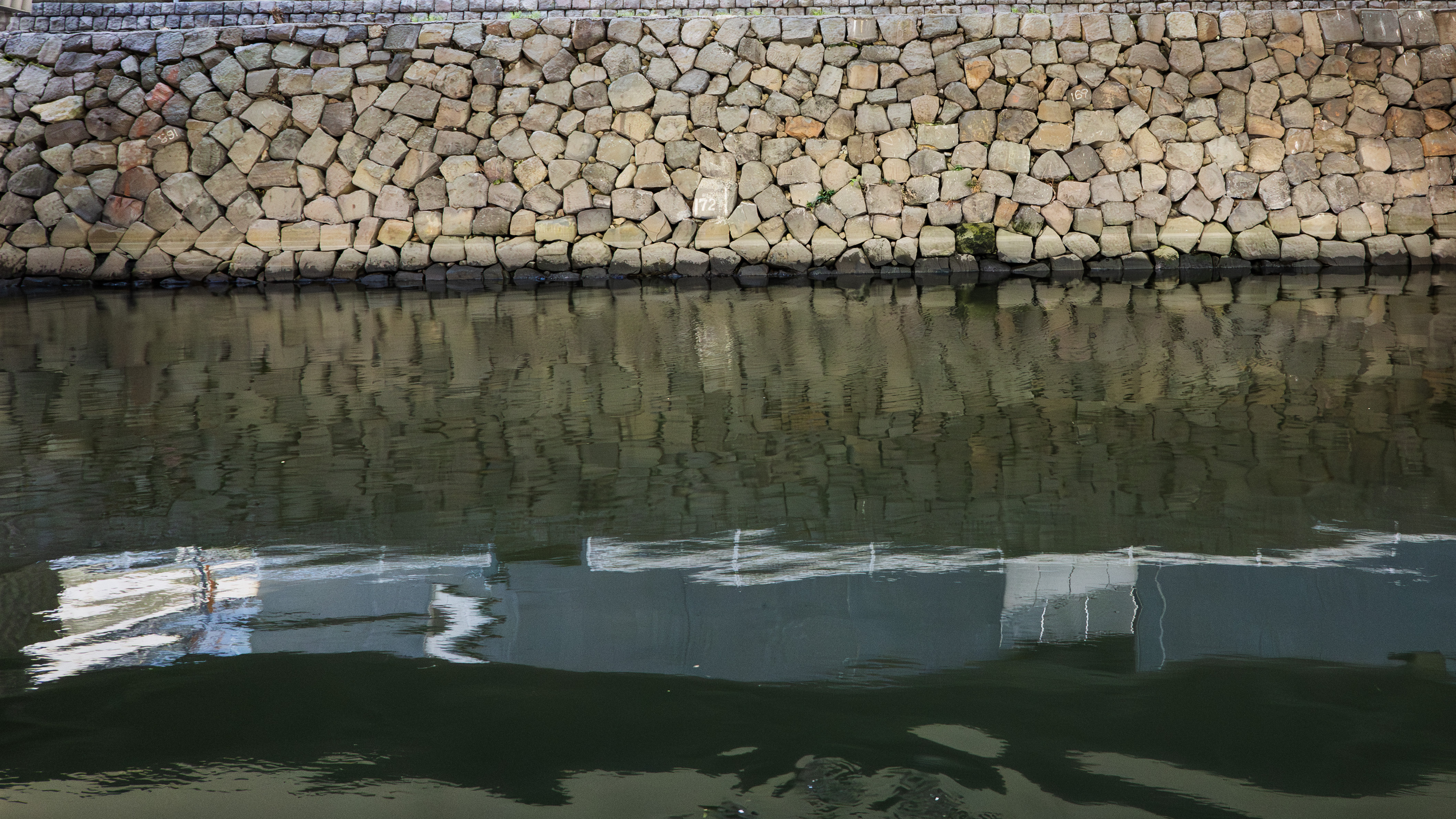①千代田の城(江戸城)の石垣遺跡。日本橋川に沿って築かれています