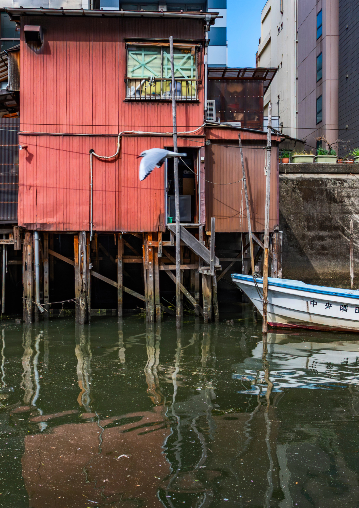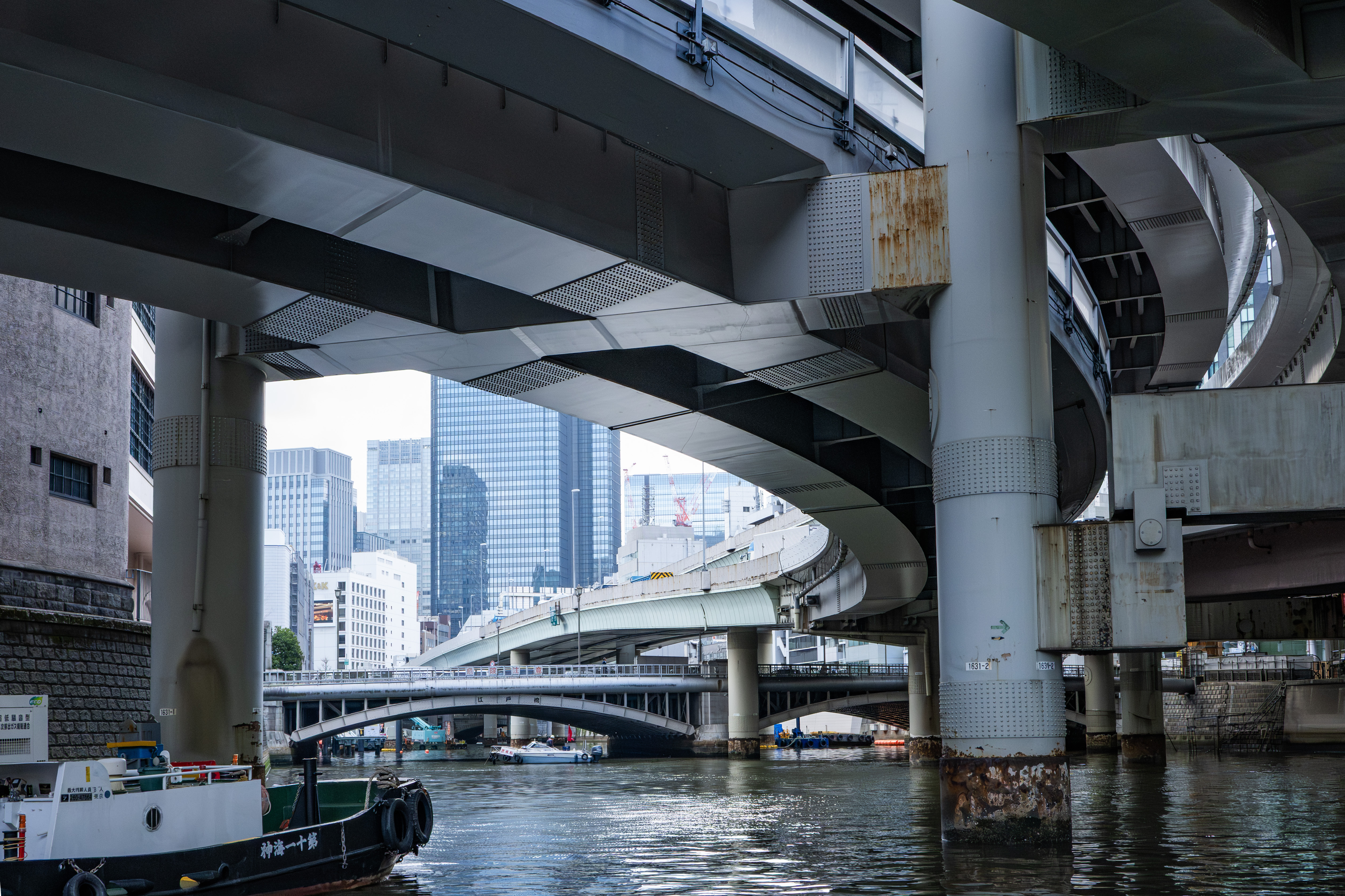 ②日本橋川の上空は首都高が覆っています。。