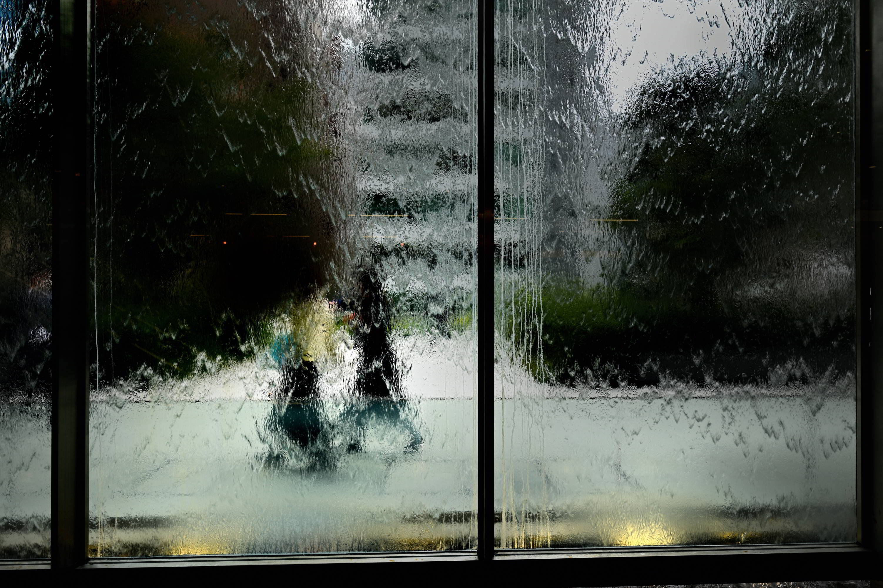 水景広告用のアクアウォール(ウォーターウォール)つまり水が流れるガラス壁面の広告メディアとのこと。