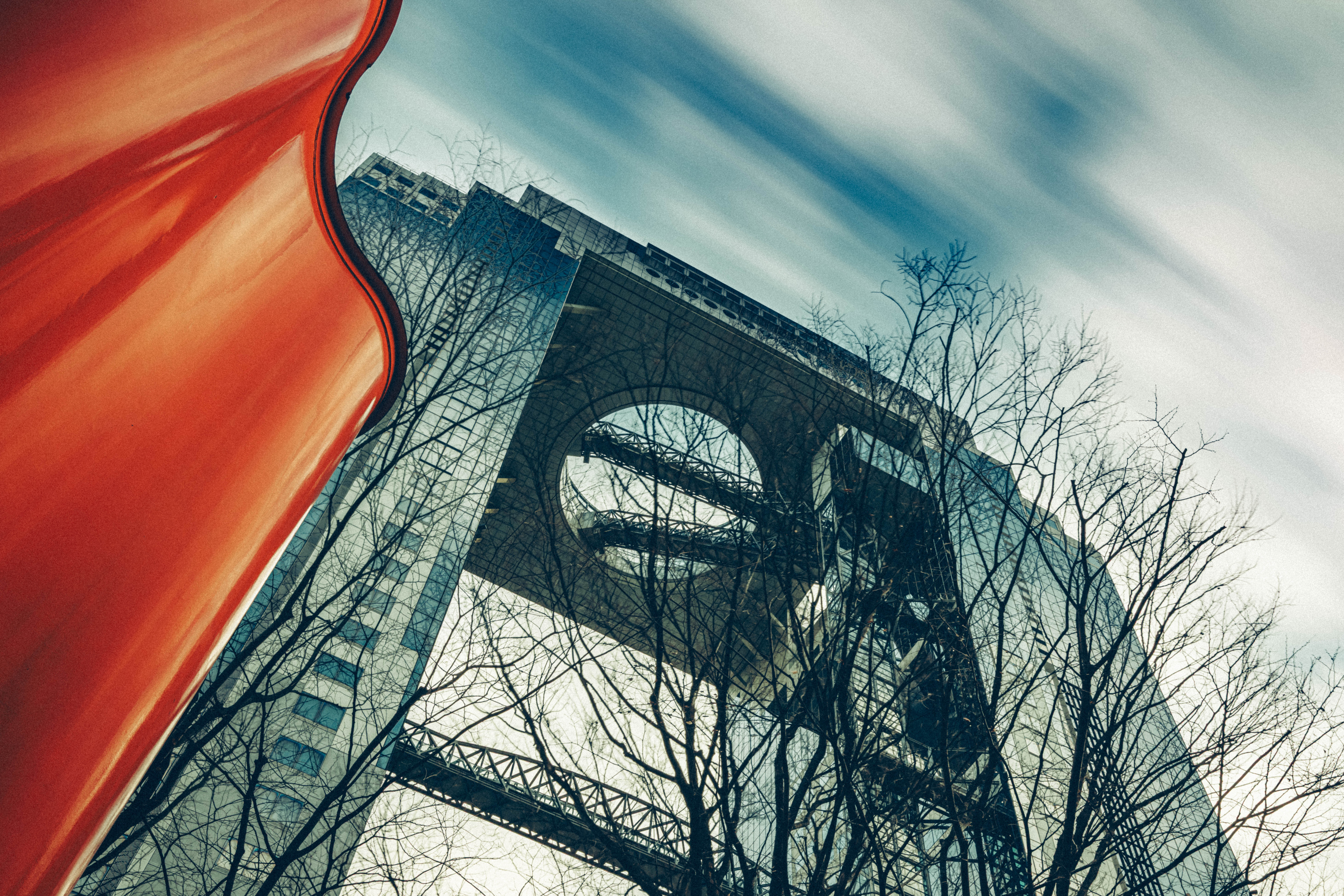 スカイビルの南側にある三色オブジェの赤いのが、北側にもありました。木と絡めて長秒露光撮影。