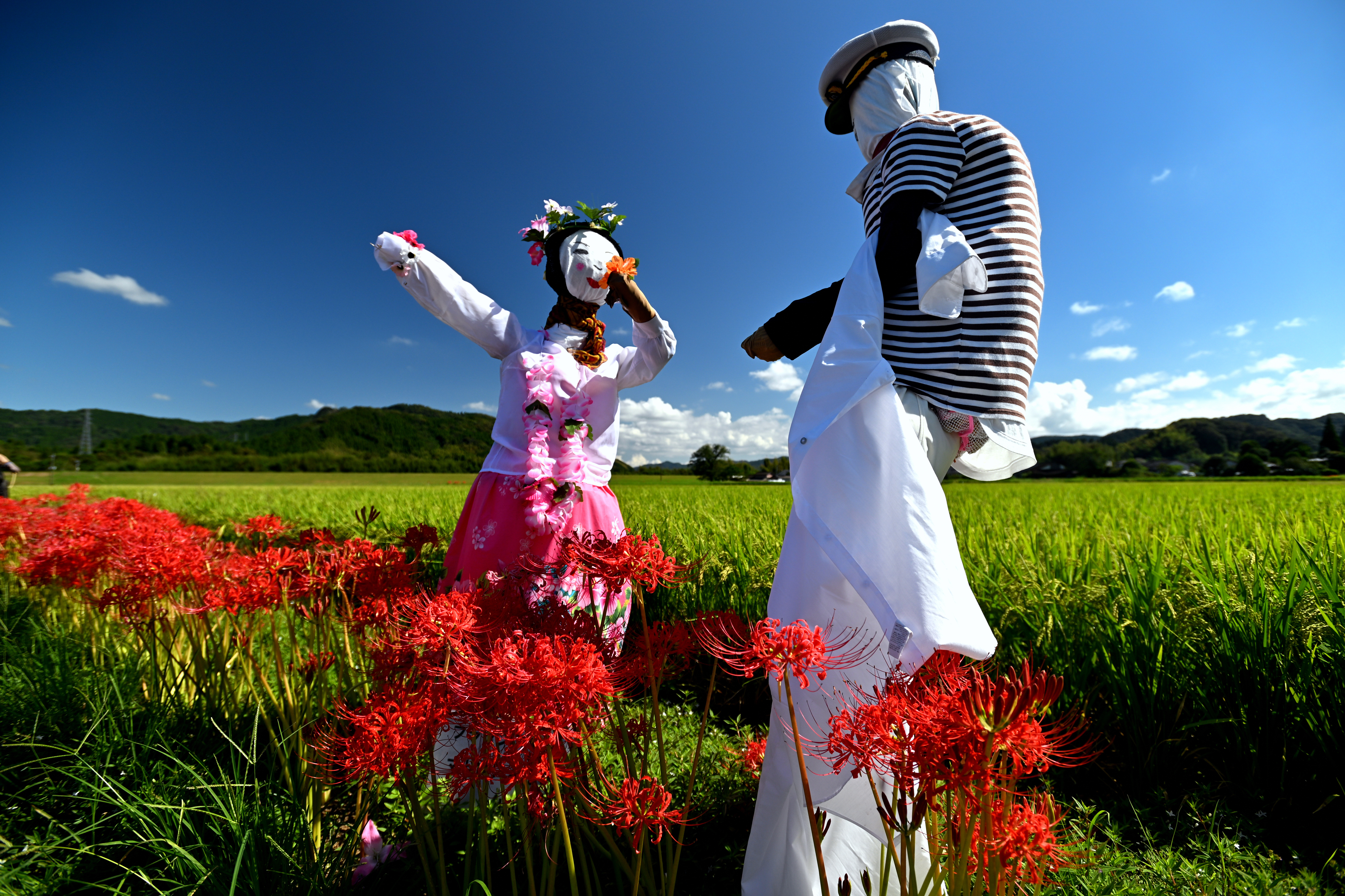 投稿を表示青空、稲穂、彼岸花、主役の案山子が秋を謳歌していますね~。素敵な切り取りです。^^