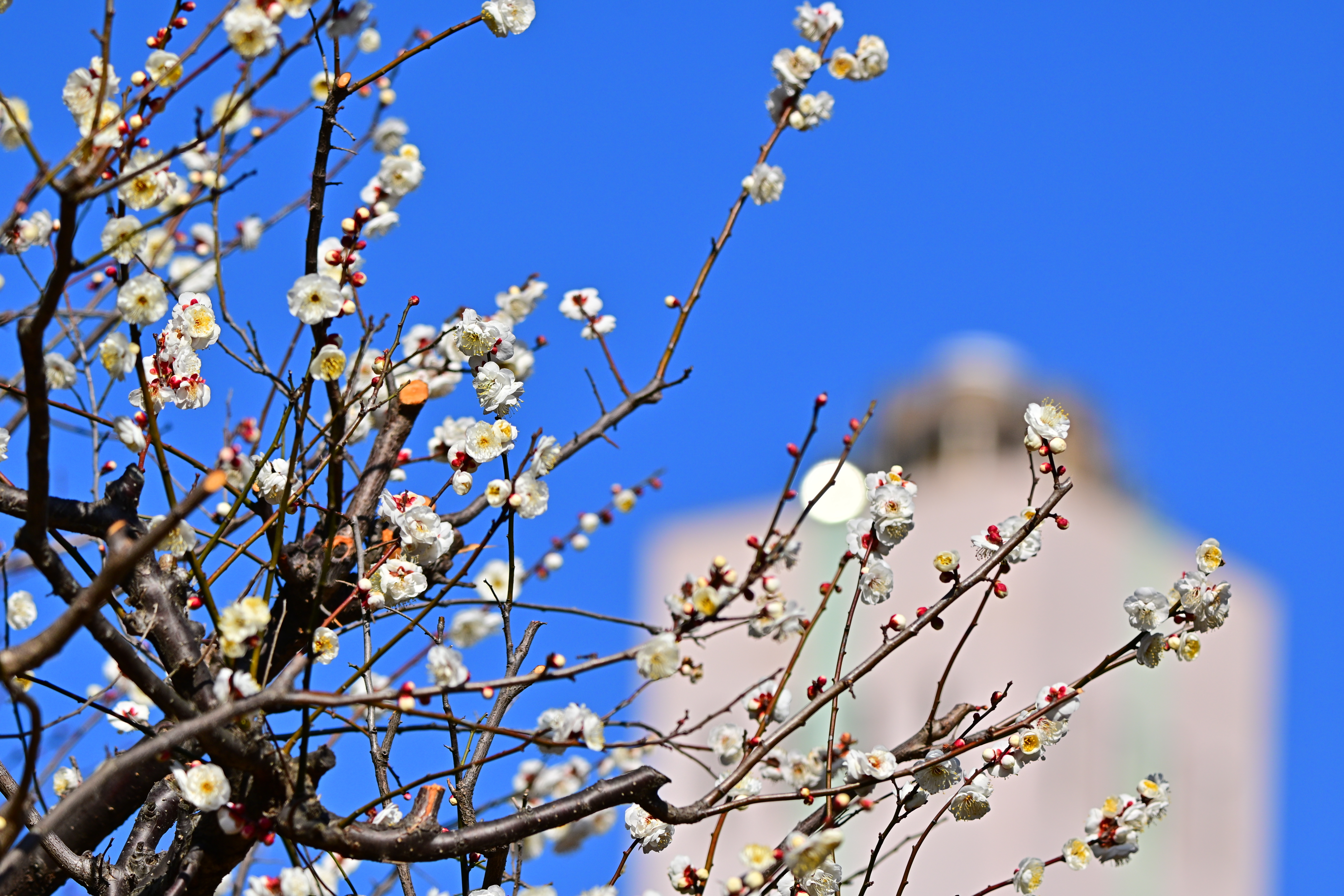 近隣の公園にも春のおとずれを感じました、ただ梅を撮っても平凡な写真になりそうなのでバックの棟(焼却炉)をぼかして入れることで画になるかと思いました。