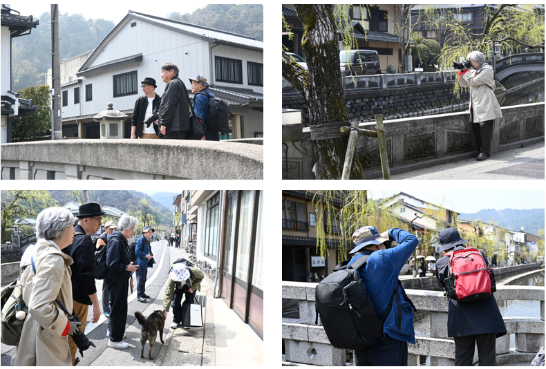柳が揺れる川沿いの道、食べ歩きを楽しめる個性的な店舗の数々、湯けむりがふわっと立ちのぼる足湯、浴衣姿で散策する外国人観光客の方など、非日常の空気を感じながら、城崎の印象的なシーンを切り取り、参加者それぞれの感性で撮影に挑みます。時には地元のご主人や甲斐犬のワンちゃんとお話をするなど、終始和やかな雰囲気で撮影が進みました。