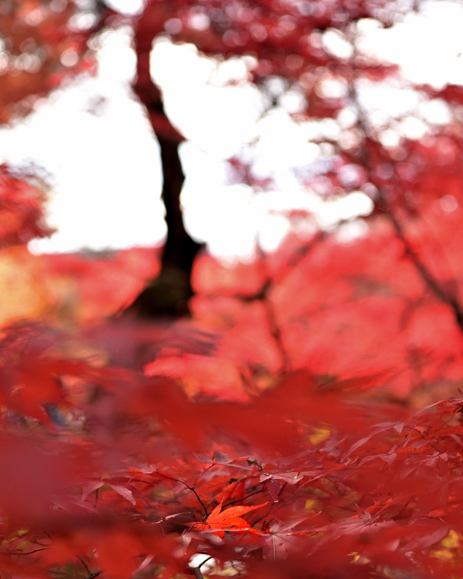 美しい木のシルエットを背景に赤い葉だまり、一葉のみ焦点を合わせて、激しさと繊細を併存させた辺りが心憎い。