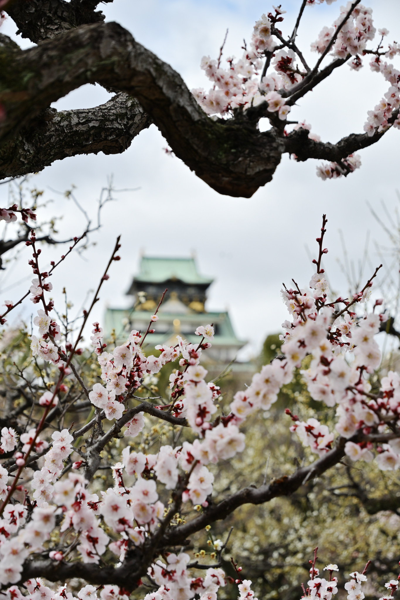 今回のシリーズは、どんなロケーションから大阪城を抜いて撮影したのかわかるように、梅を主人公(近景)にした写真と大阪城を主人公(遠景)にした写真を対比してご紹介して