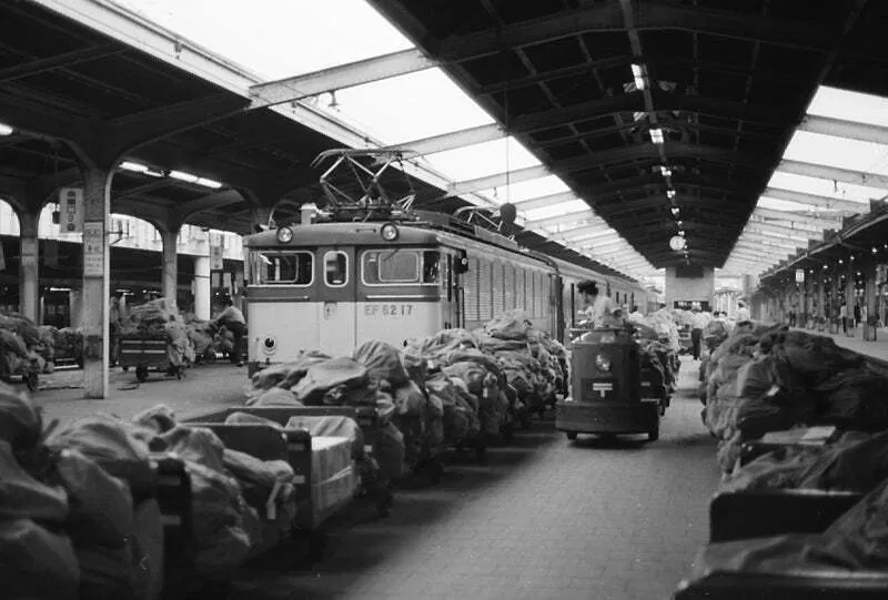 8枚目は電気機関車が牽く客車列車に連結されていた郵便車から降ろされた郵袋の山。郵便・荷物専用ホーム上を、ターレットと呼ばれる牽引機が台車を引いて動き回っています。