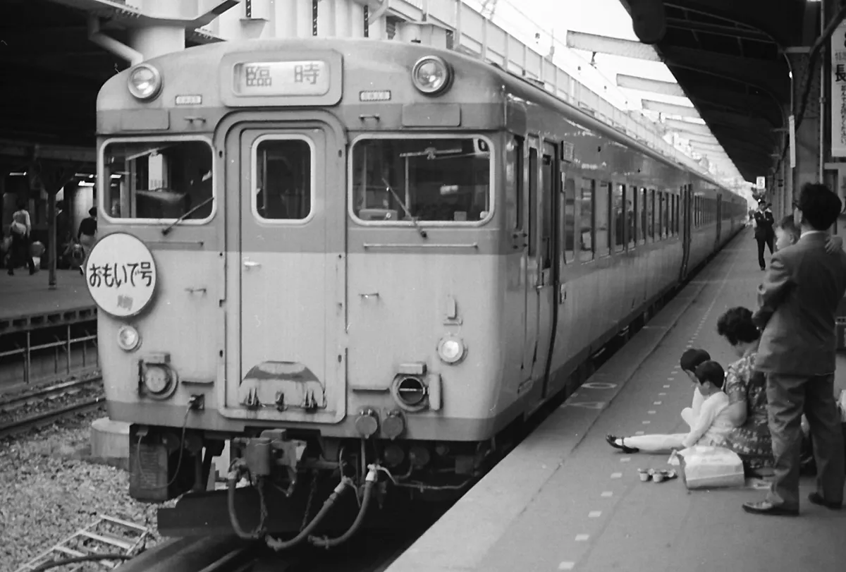 6枚目は非電化区間用の修学旅行専用列車「おもいで」。ホームに座り込む家族は、次の長距離列車の自由席確保で並んでいるのでしょうか。