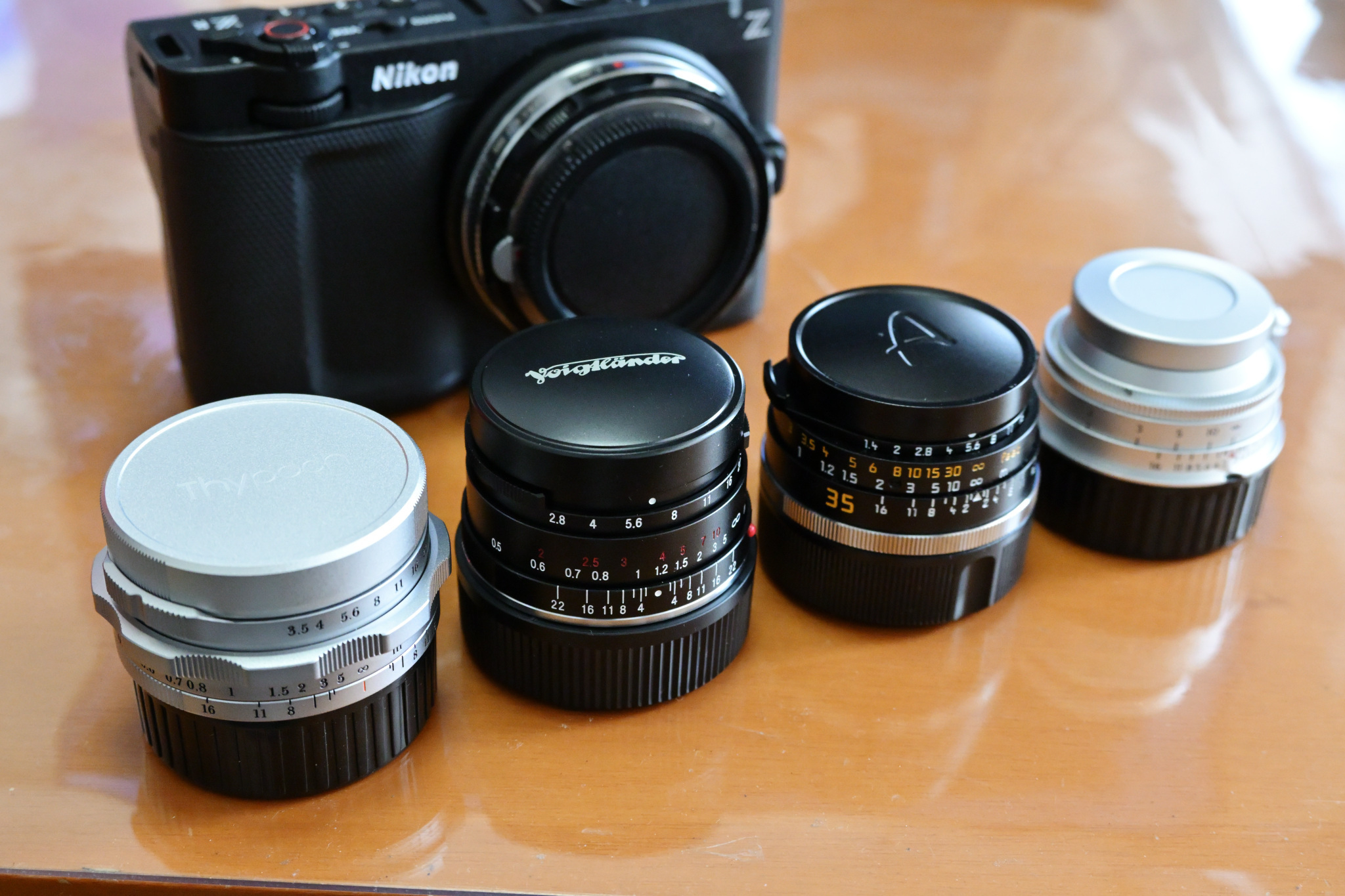 着せ替えのレンズは、以下のライカMマウントレンズ4つ。いずれも焦点工房のヘリコイド付きマウントアダプターを介してNikon ZRに装着しています。