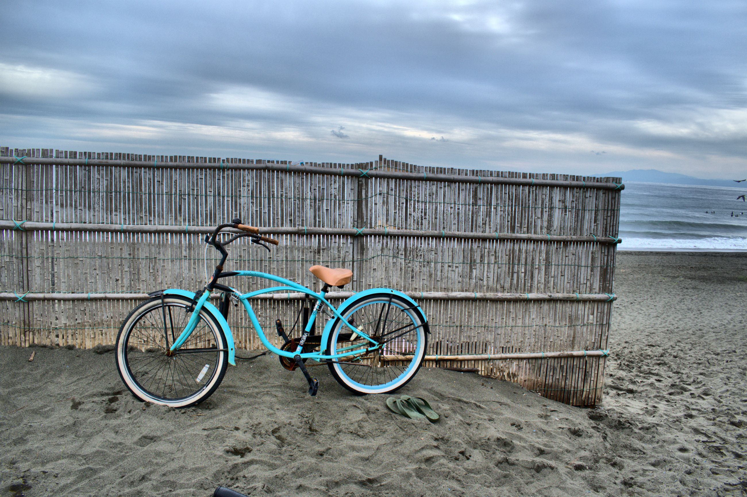 投稿を表示お洒落な水色の自転車。このようなデザインは舶来か?。そばに脱ぎ捨てられたゴムのサンダル。サーファの物か。なんとなくフェンスの向こう側は何があるのかと連想させるシンプルですが、いい切り取りだと思います。