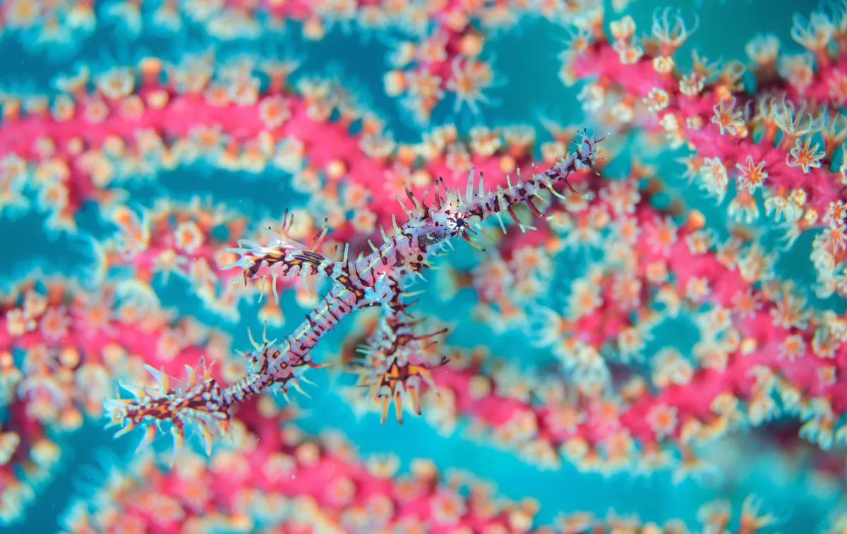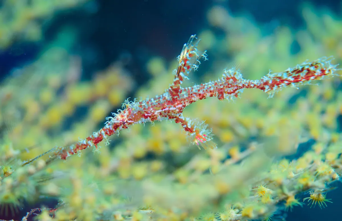 ニシキフウライウオというカラフルな細い体に小さなトゲのようなものが沢山出ている魚です。あまり泳ぎ回らずにサンゴや海藻に寄り添って擬態しています。