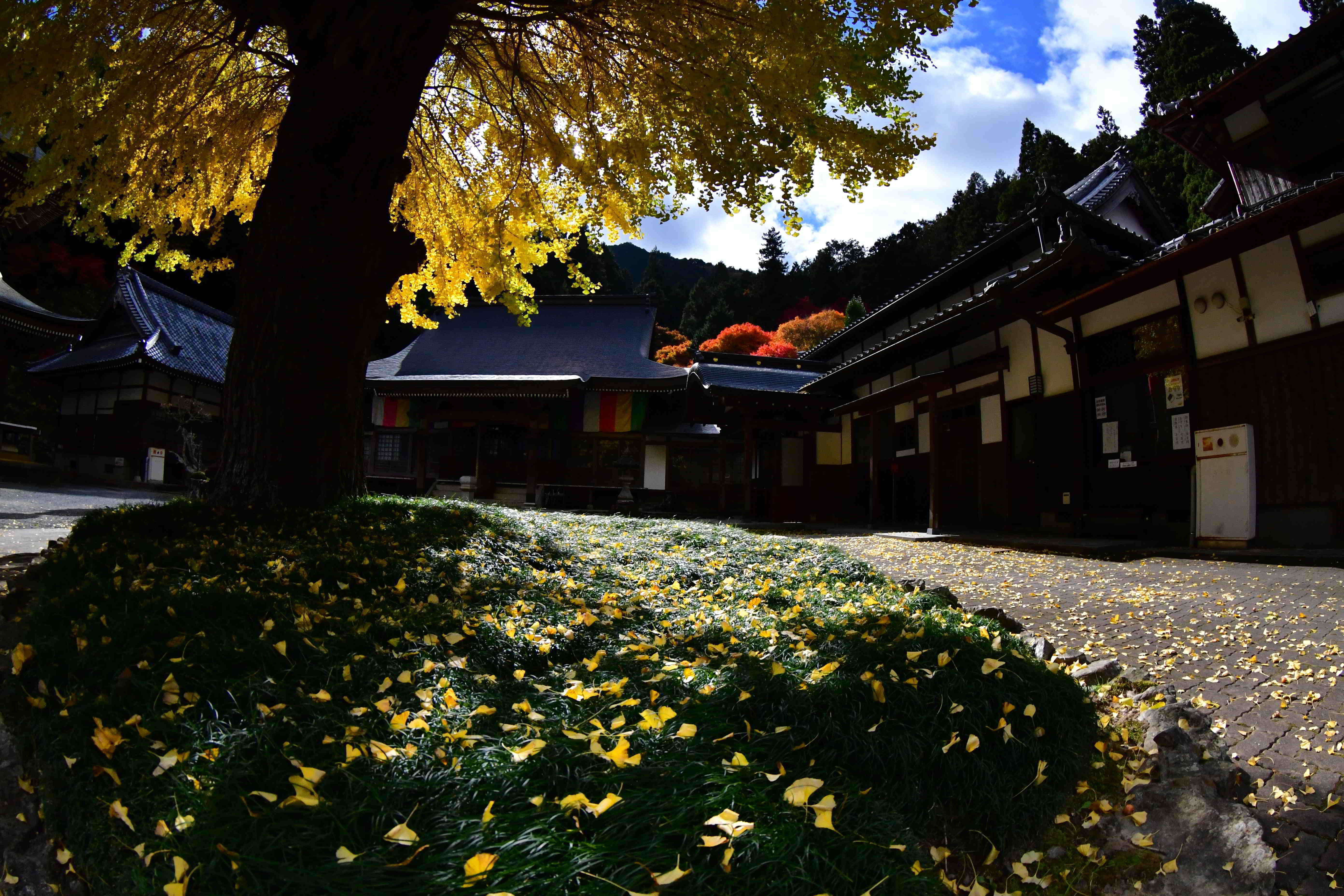 山寺の日没は盆地の形状で回りの山が高く、午後3時を過ぎると日が陰ります。黄金色に輝く銀杏も風に吹かれて夕景を迎えます。