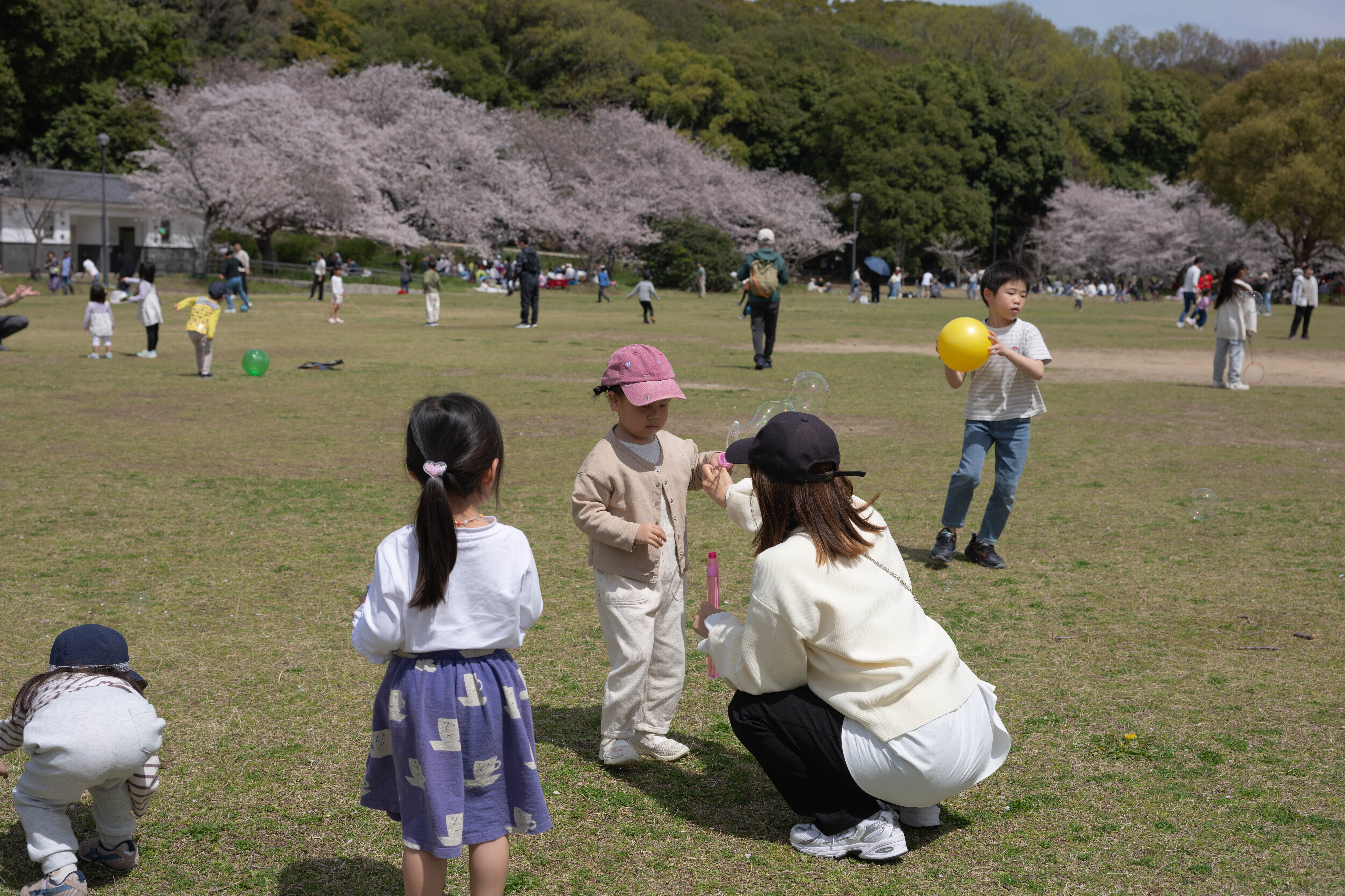 桜の咲く公園で遊ぶ子供たち季節感があってとてもいい写真です。
