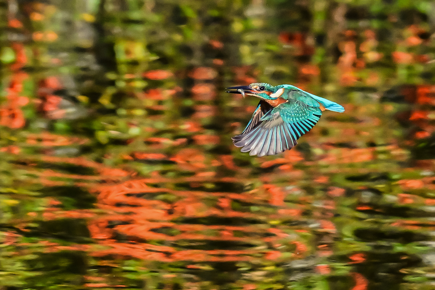 投稿を表示紅葉の映り込みを背景に翡翠の飛ぶ姿、見事な作品ですね。ナイスショットです。^^