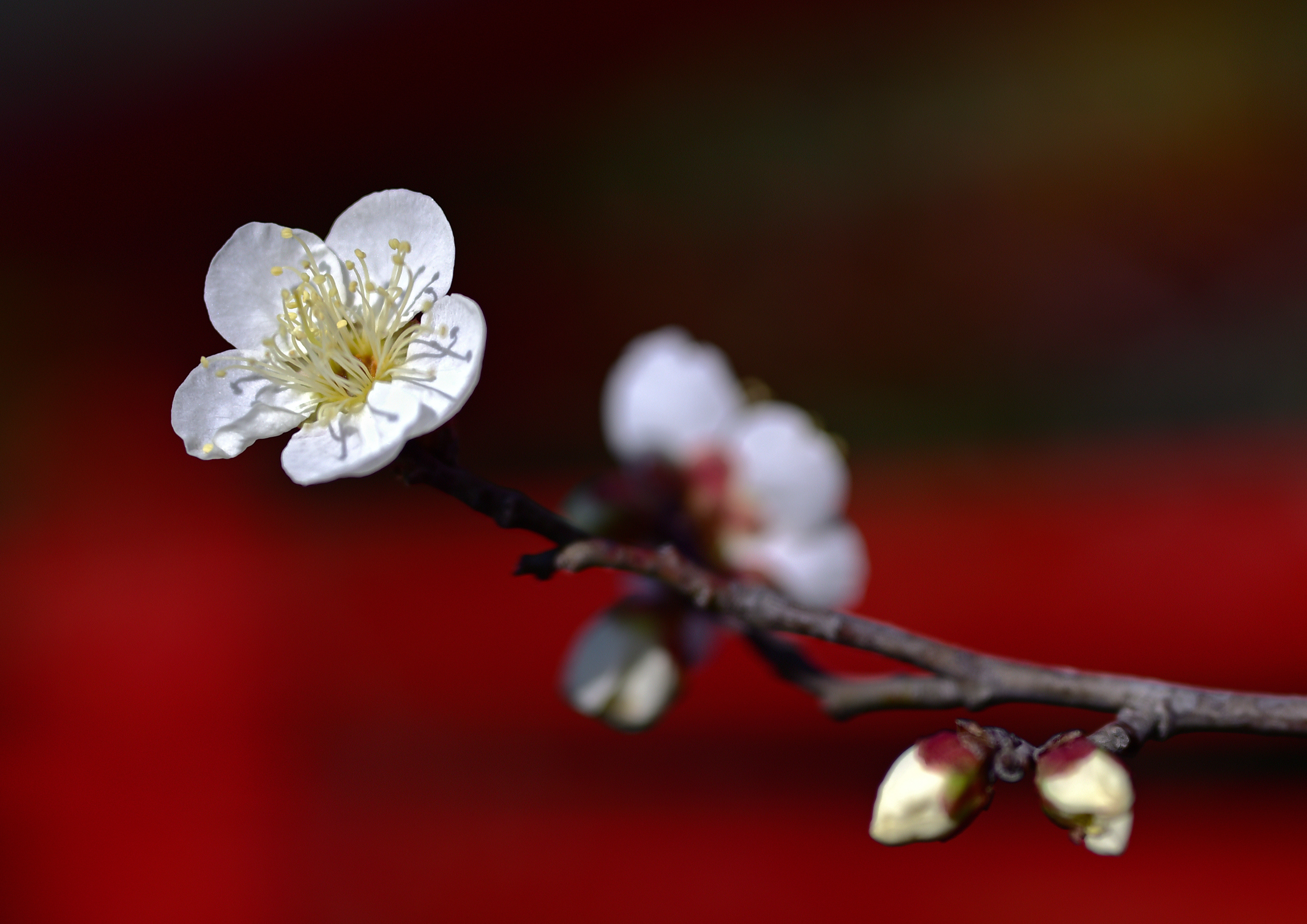紅の背景は白梅が映えますね。私も大好きな取り合わせです。